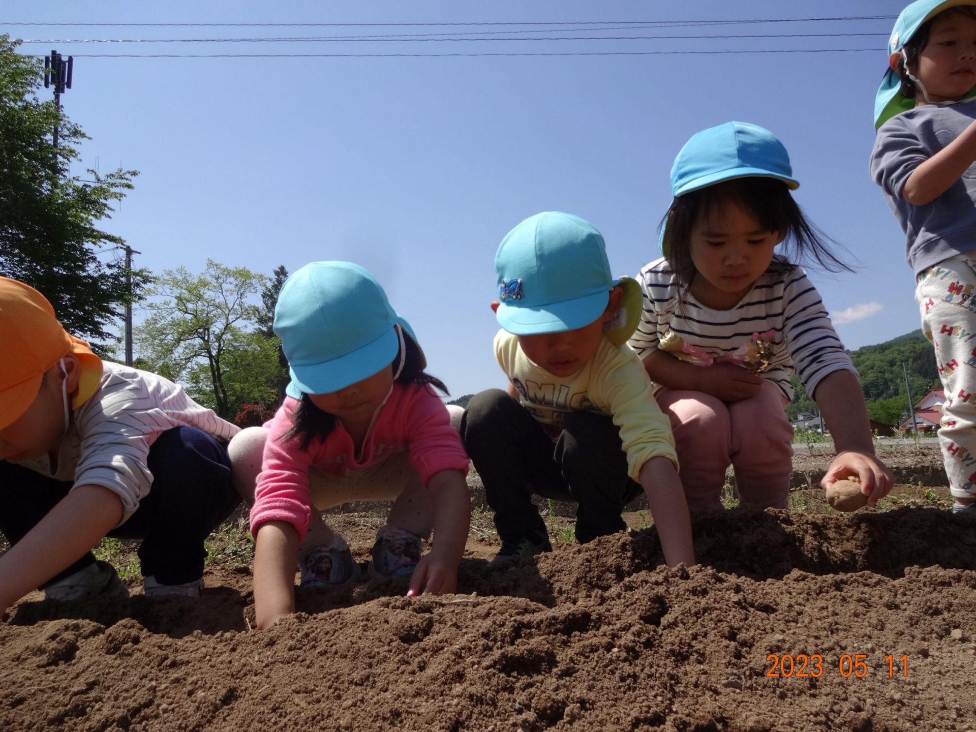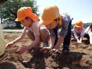 ふかふかになった土の中にジャガイモの種芋を植えました。