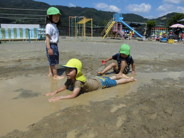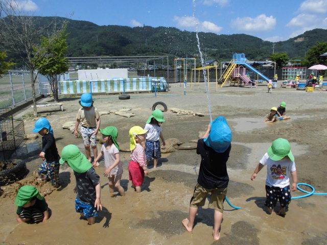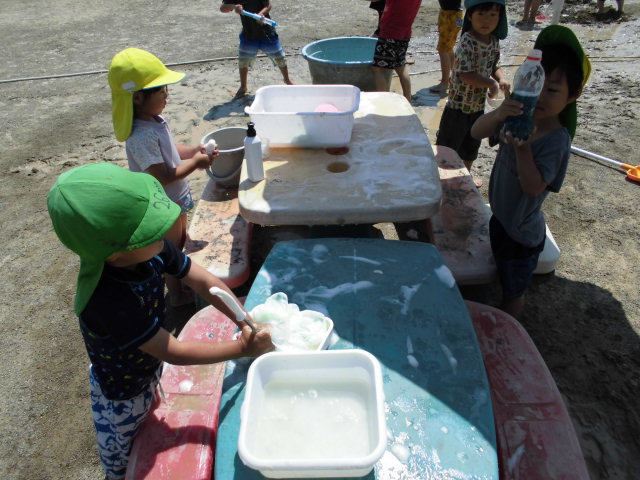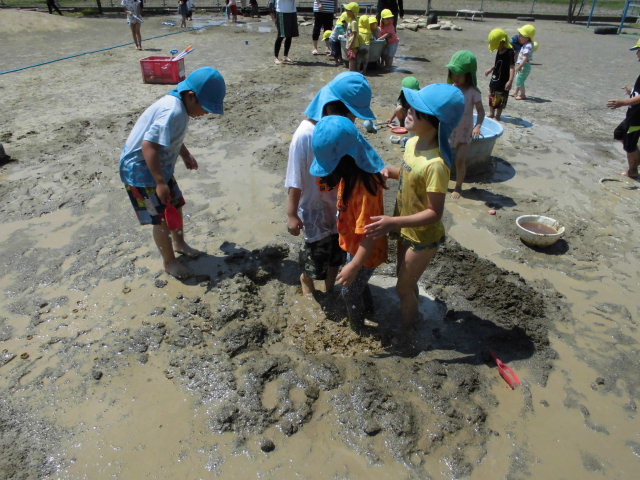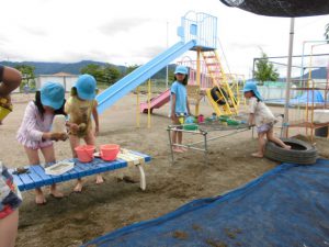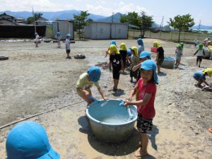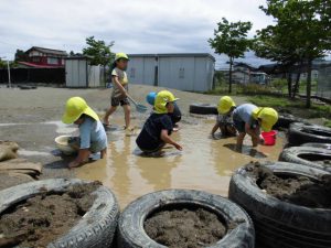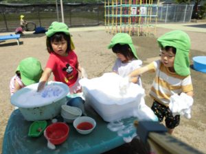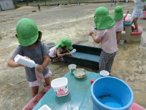 泥んこが苦手な子どもたちは、水をくんできてアイスクリーム屋さんの準備をしています。