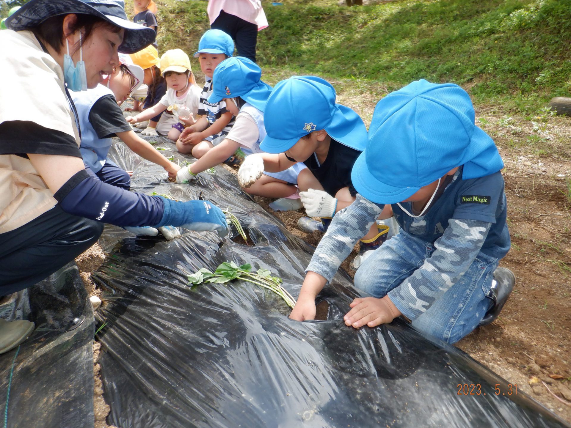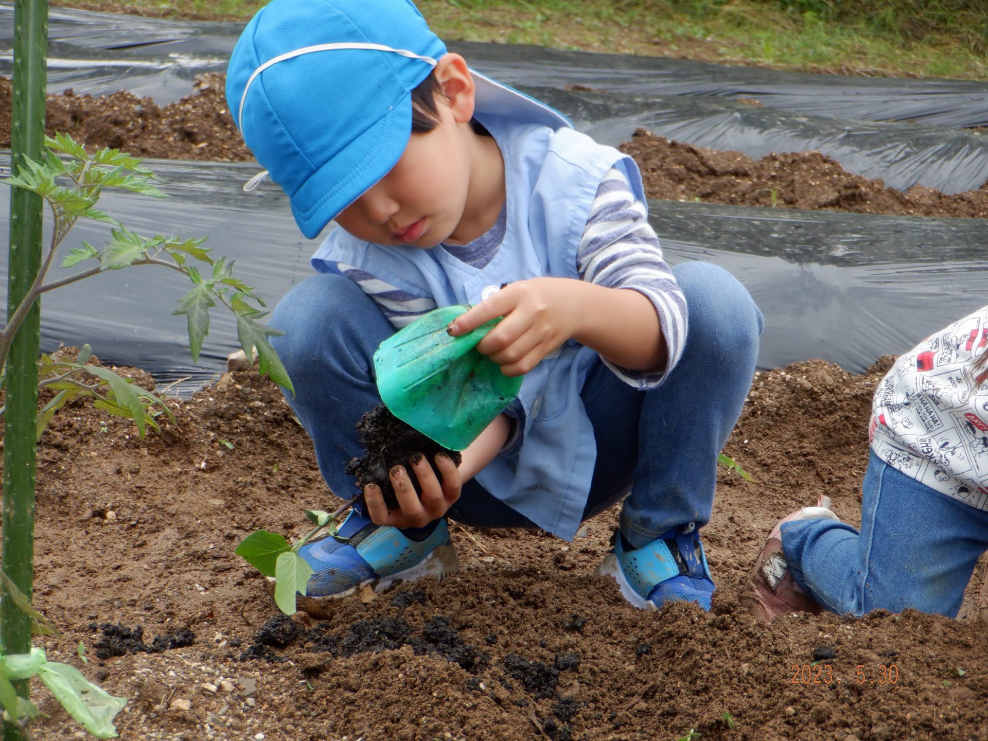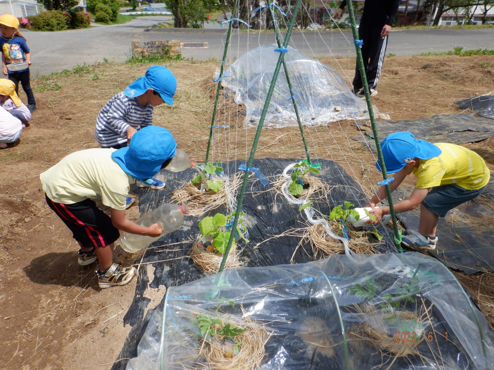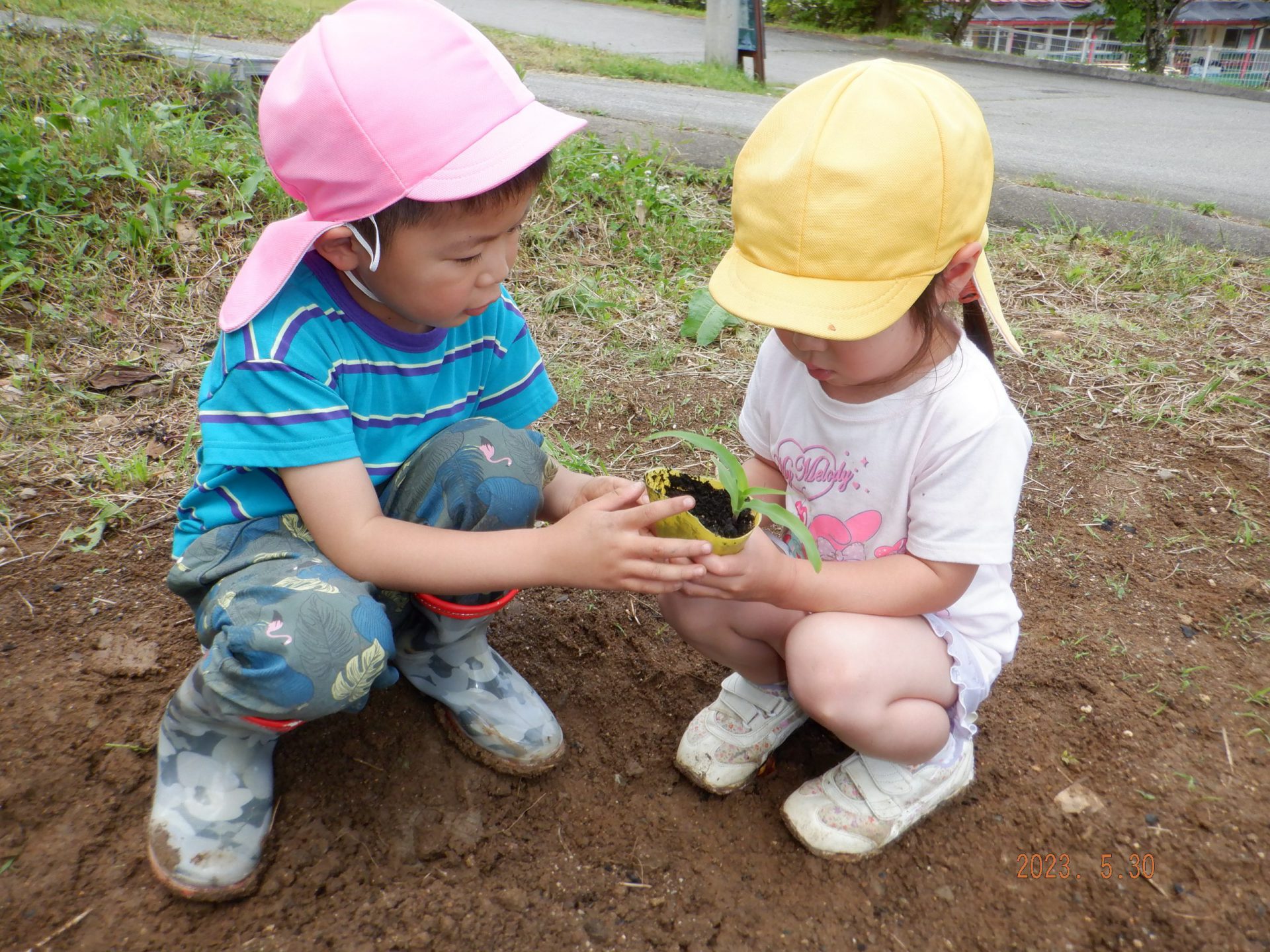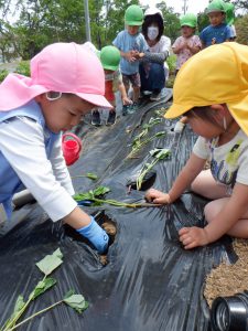 ・年長さんが、小さいお友だちに野菜の植え方や、水やりの仕方を優しく教えてあげている姿が見られました。昨年教えてもらったことを覚えているのかな。と嬉しく思いました。