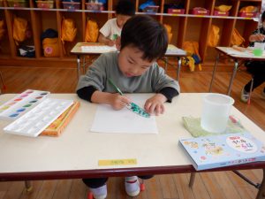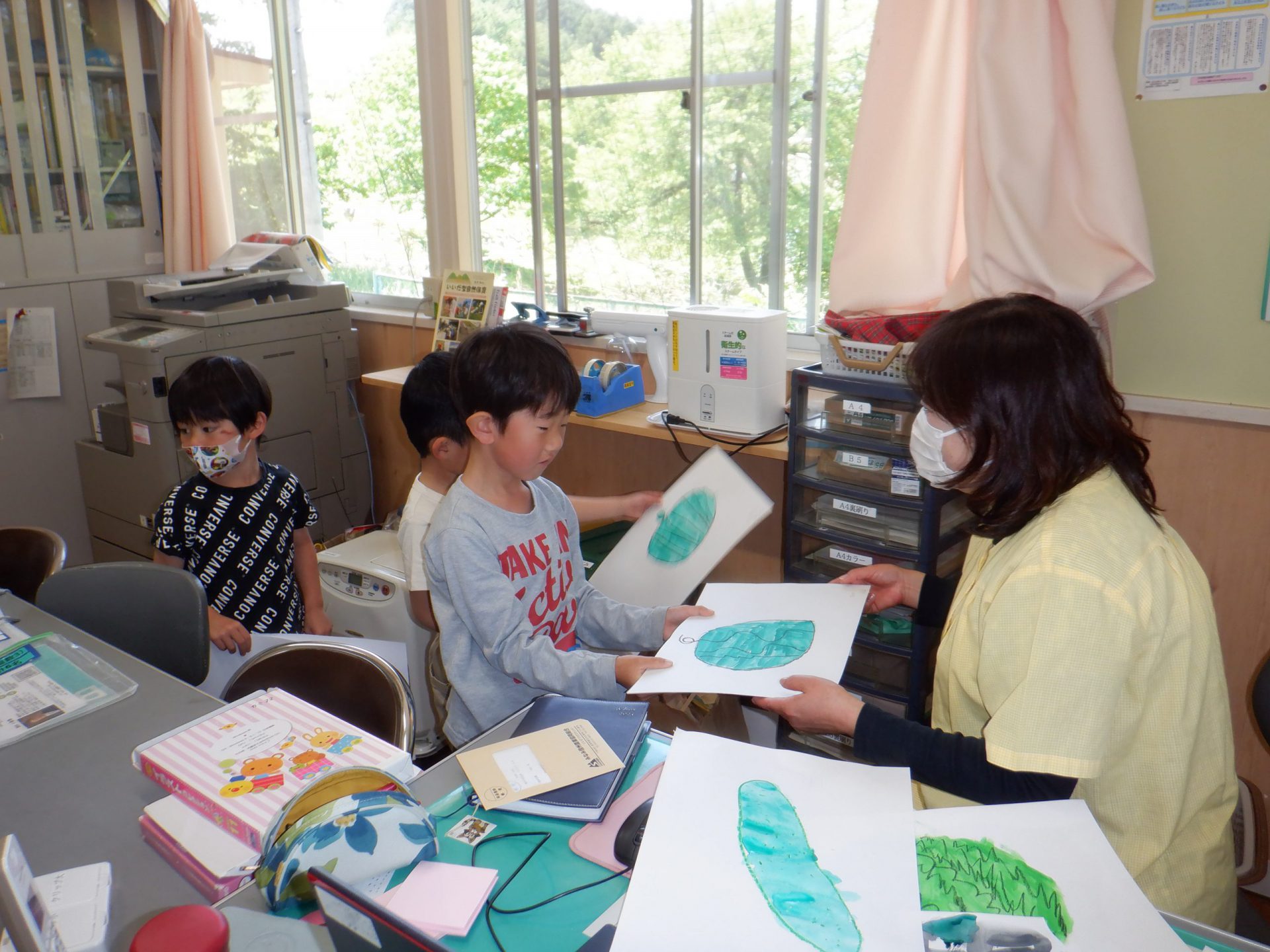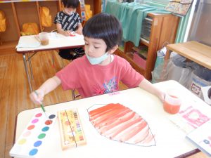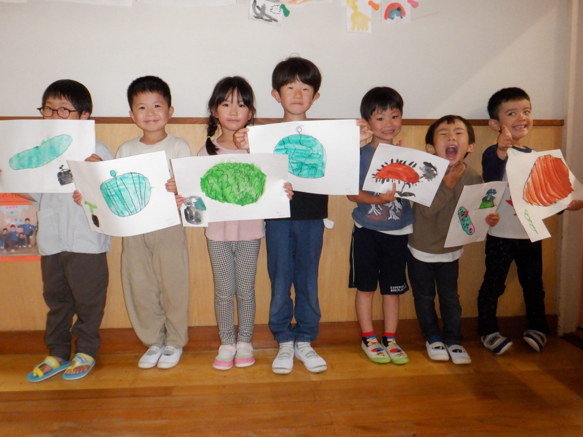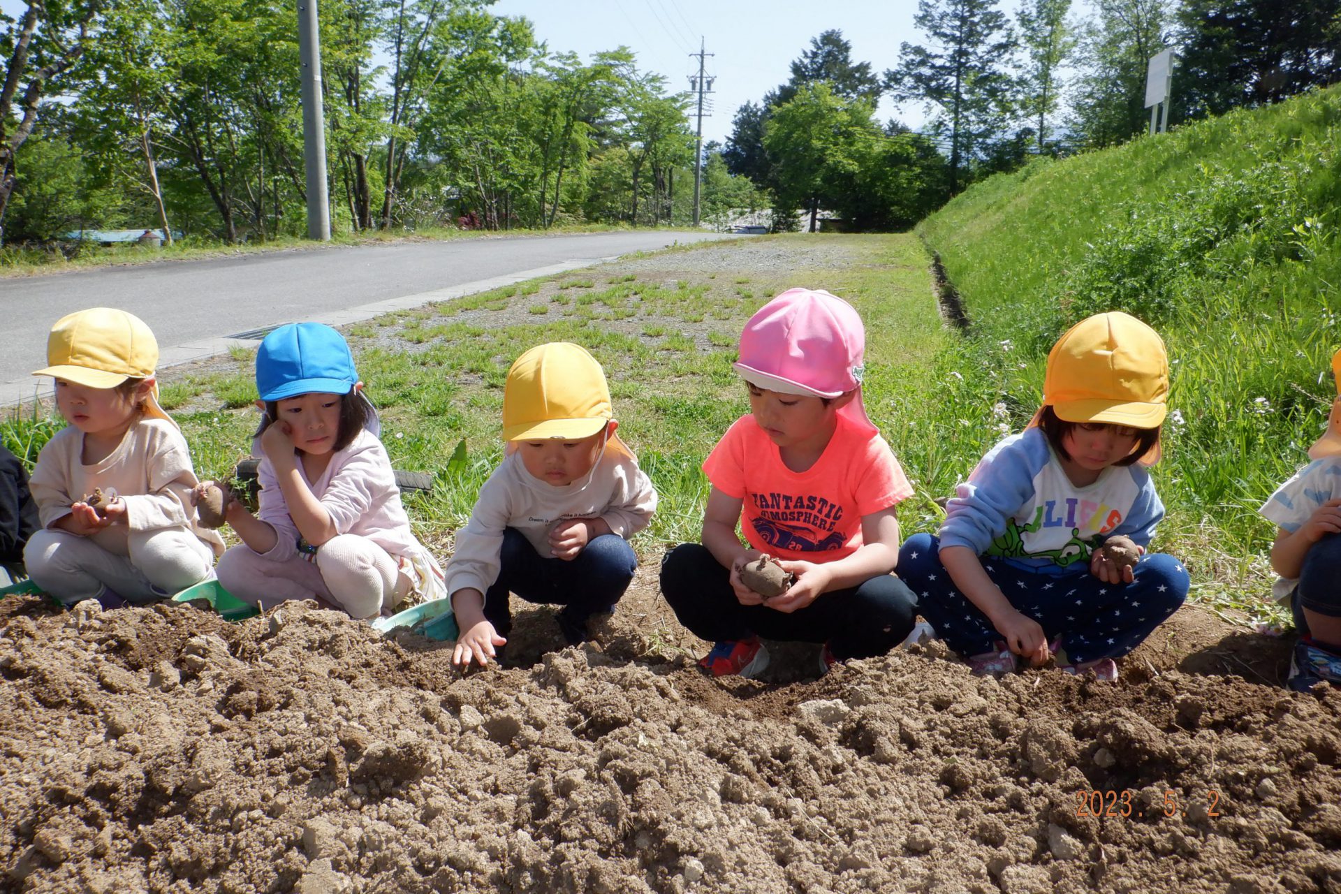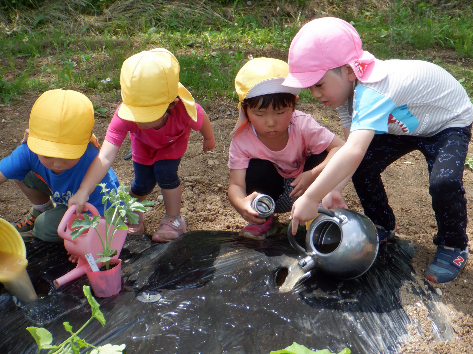 ・年長さんが、小さいお友だちに野菜の植え方や、水やりの仕方を優しく教えてあげている姿が見られました。昨年教えてもらったことを覚えているのかな。と嬉しく思いました。