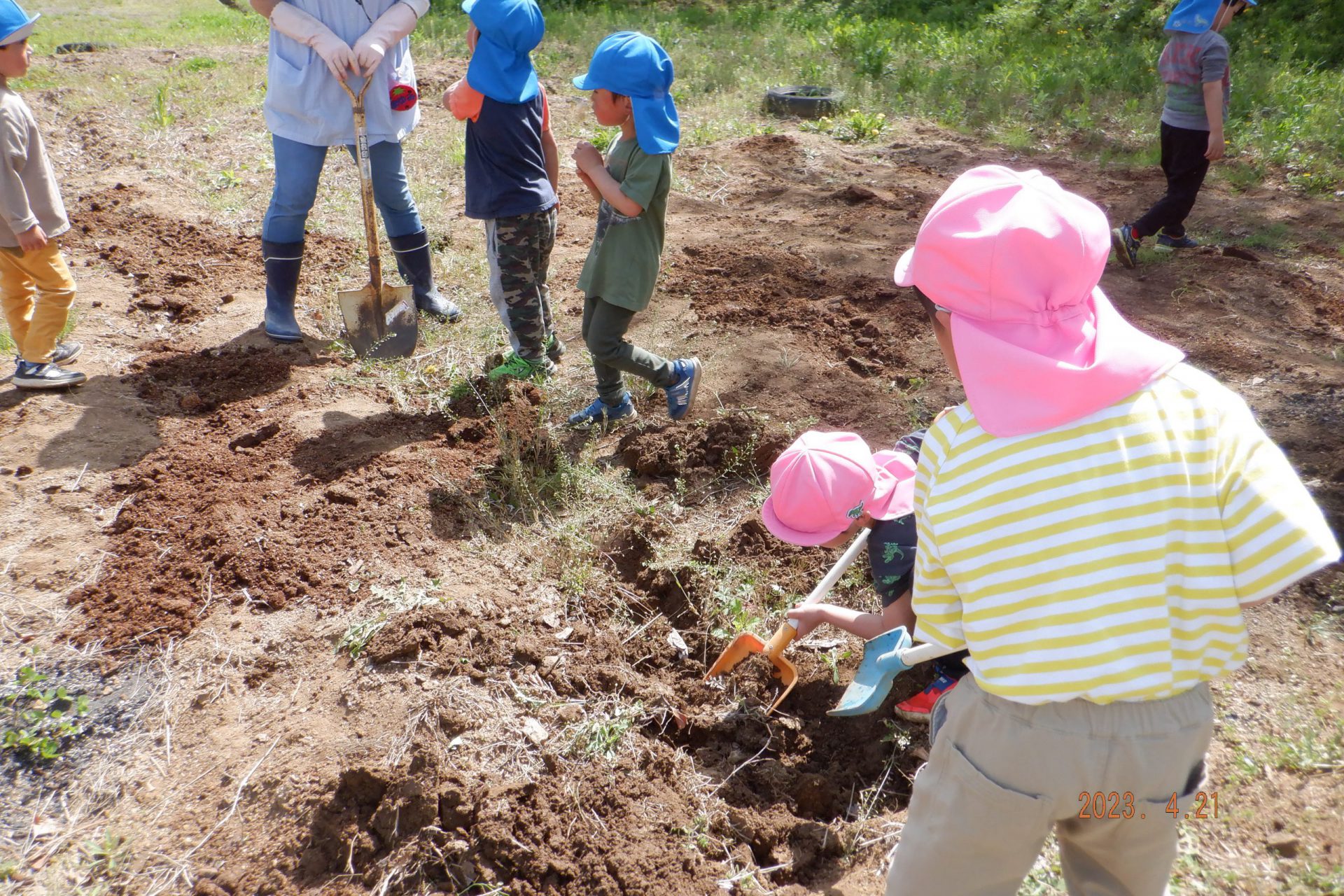 「土がゴツゴツしていて堅いね。」「ここにジャガイモ植えても大丈夫かなぁ?」