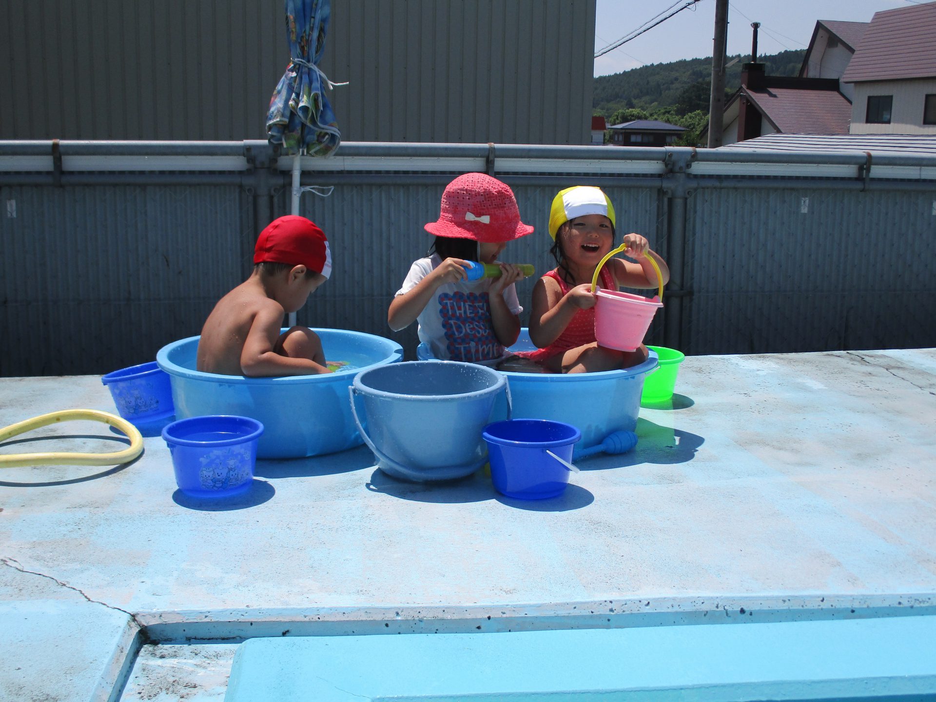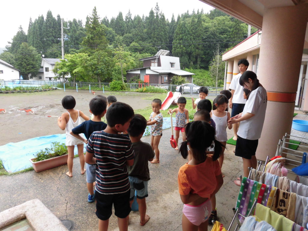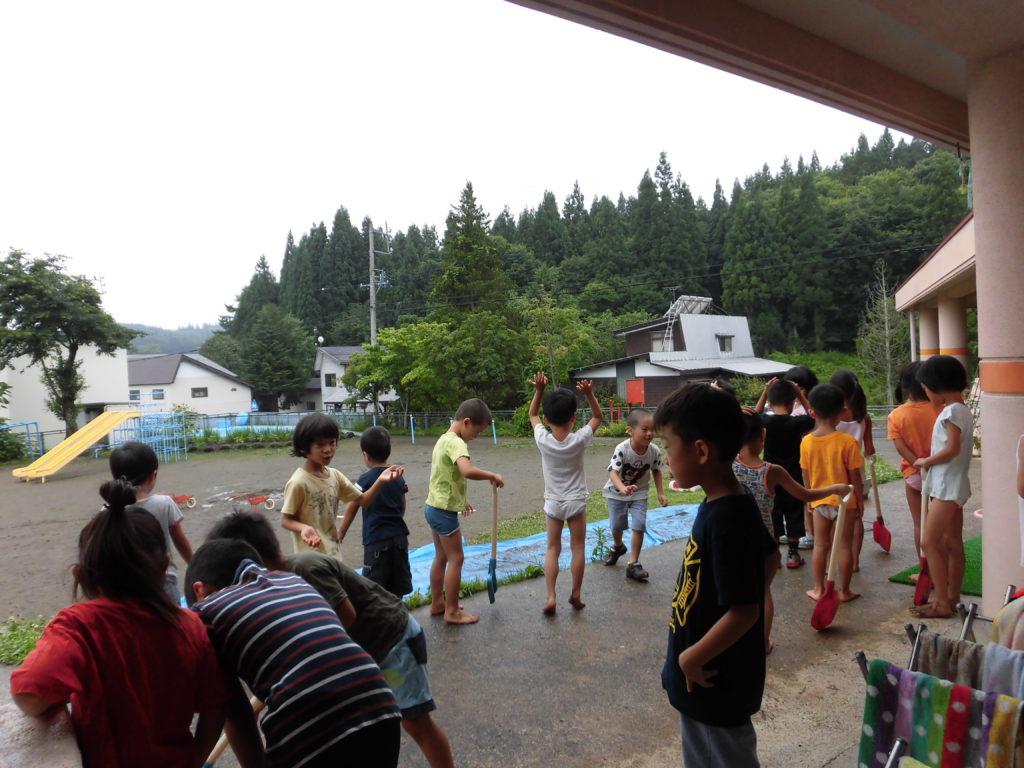 夏に入り、天気を見ながら子ども達は泥遊びやプール遊びを楽しんでいます。