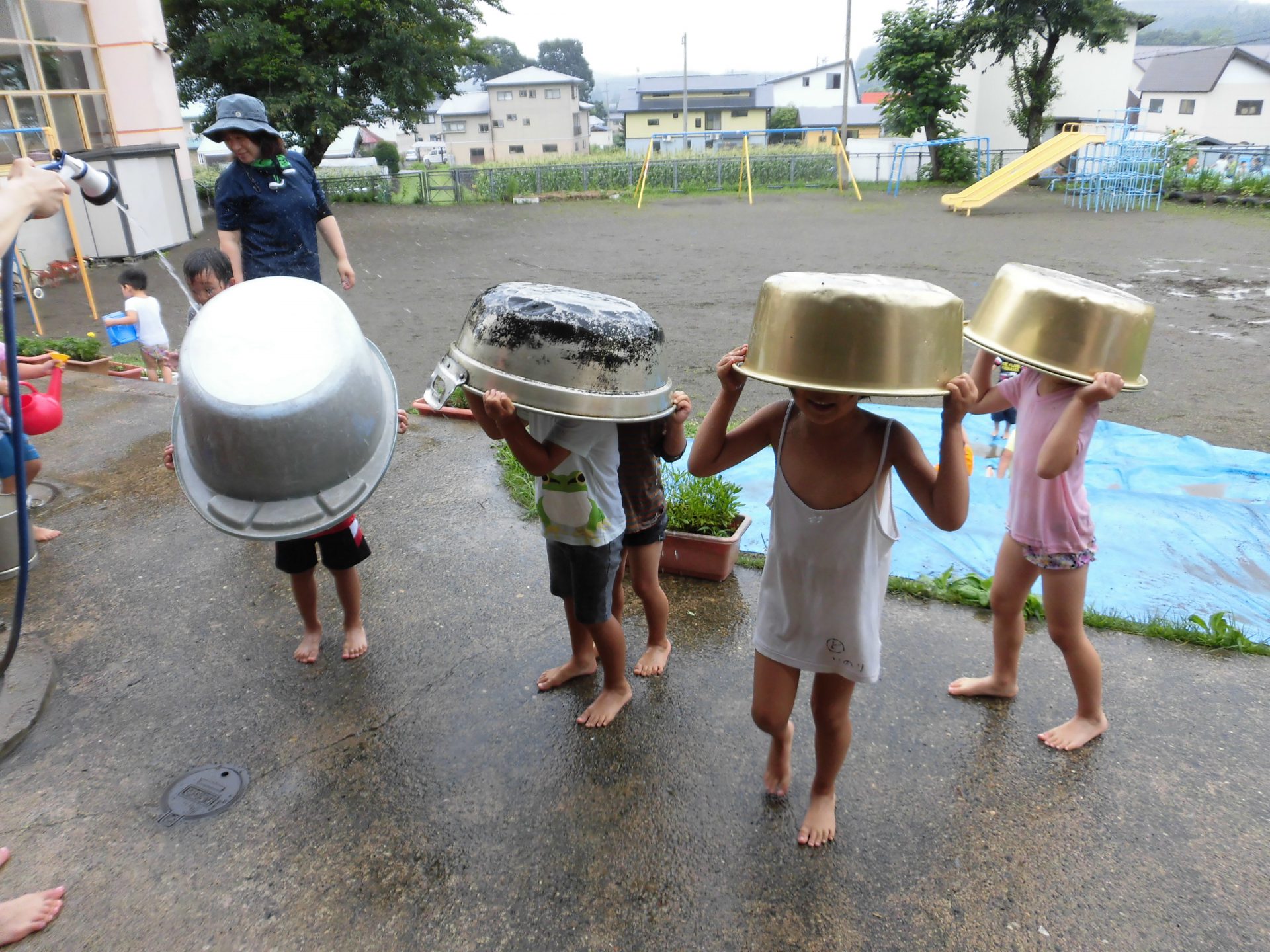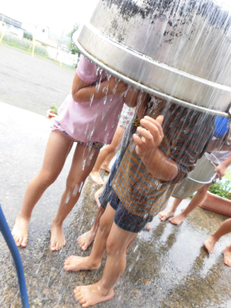 年中児も真似してたらいやバケツを自分で探し、頭の上へ。
