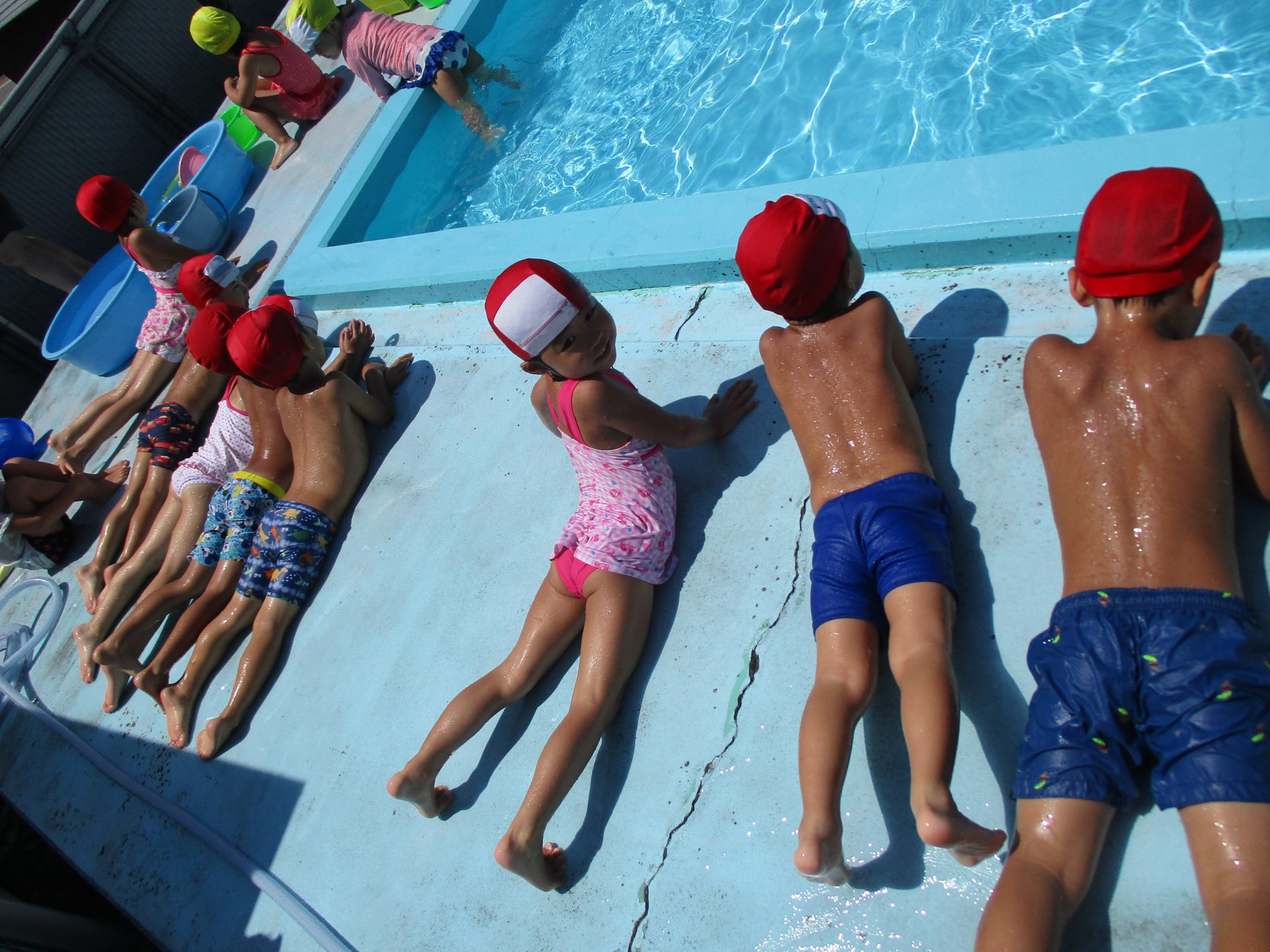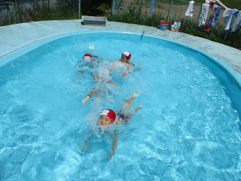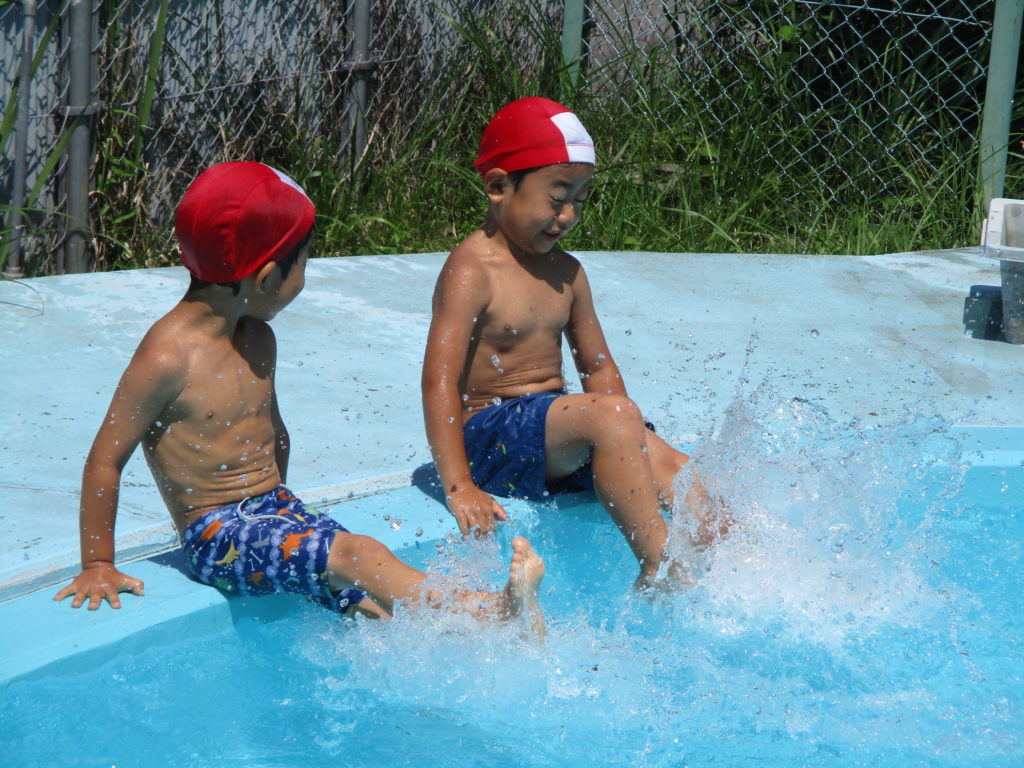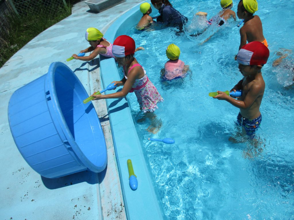 プールでは、水の危険な部分もしっかり伝えながら、子ども達の「やってみよう!」という姿を大切に、水量や玩具、遊びなどを工夫していきたいと思います。