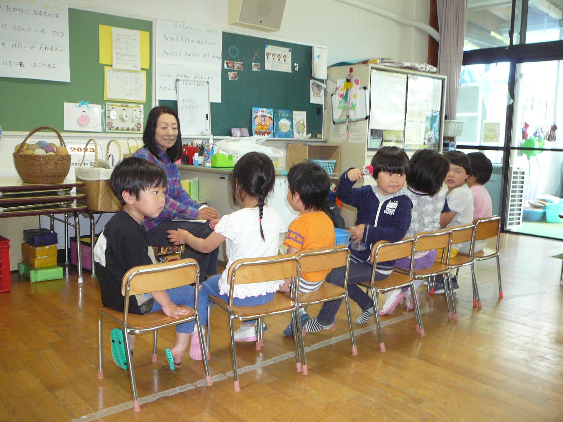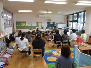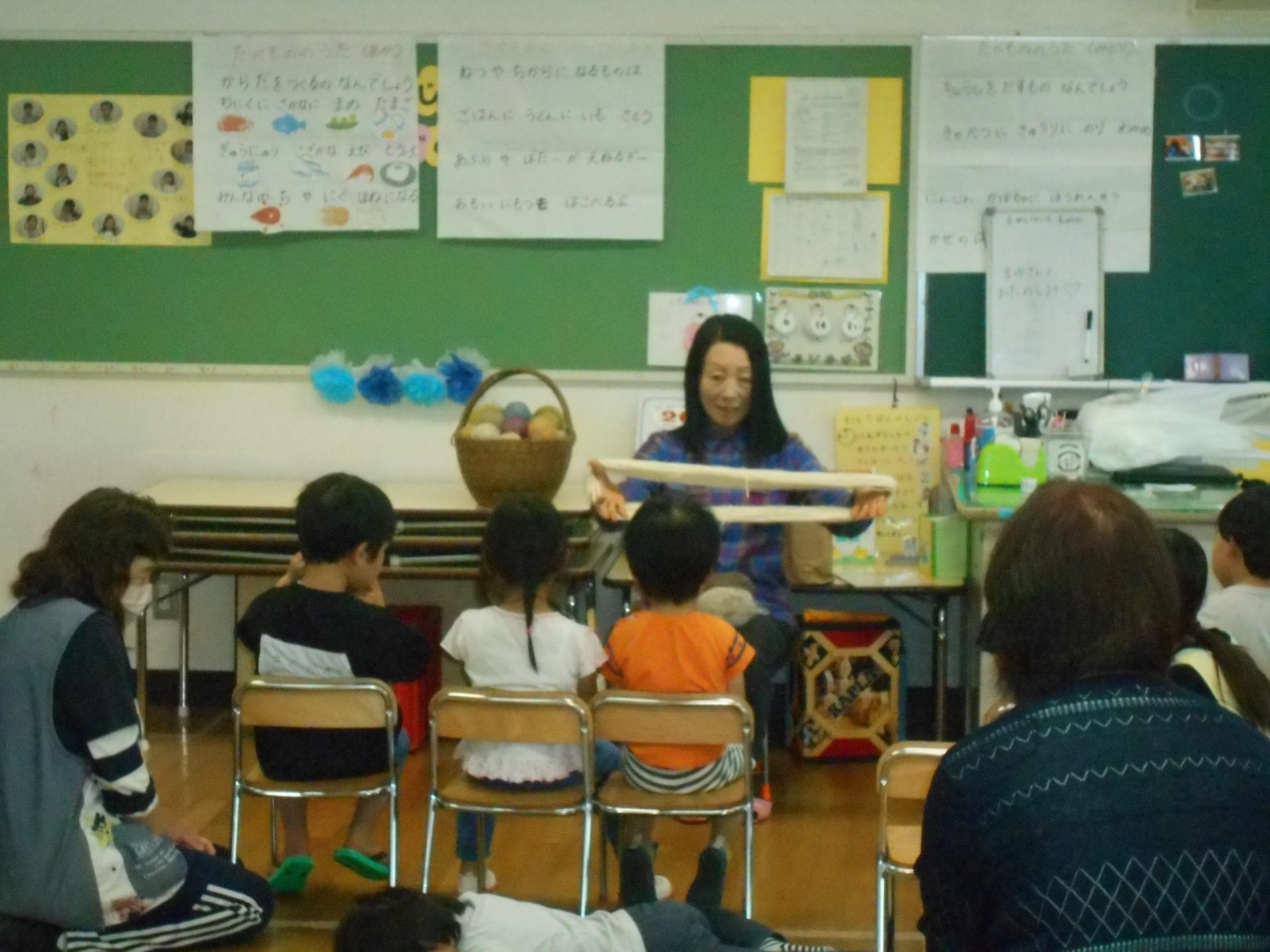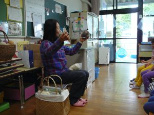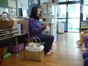 今日は県のやまほいく研修で“森のようちえん ぴっぴ”の「まゆさん」が来てくださいました。