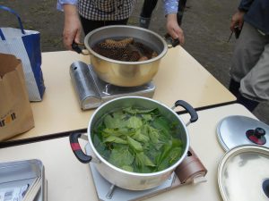 今日は摘んできた“桑の葉・コンフリーの葉”と園にたくさんあった“タマネギの皮・松ぼっくり”で染めることにしました。