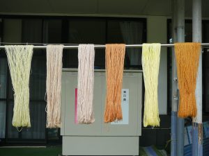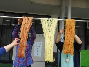 染まった毛糸はお湯で洗って、軒に干していきます。さて、出来映えは・・・