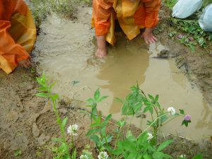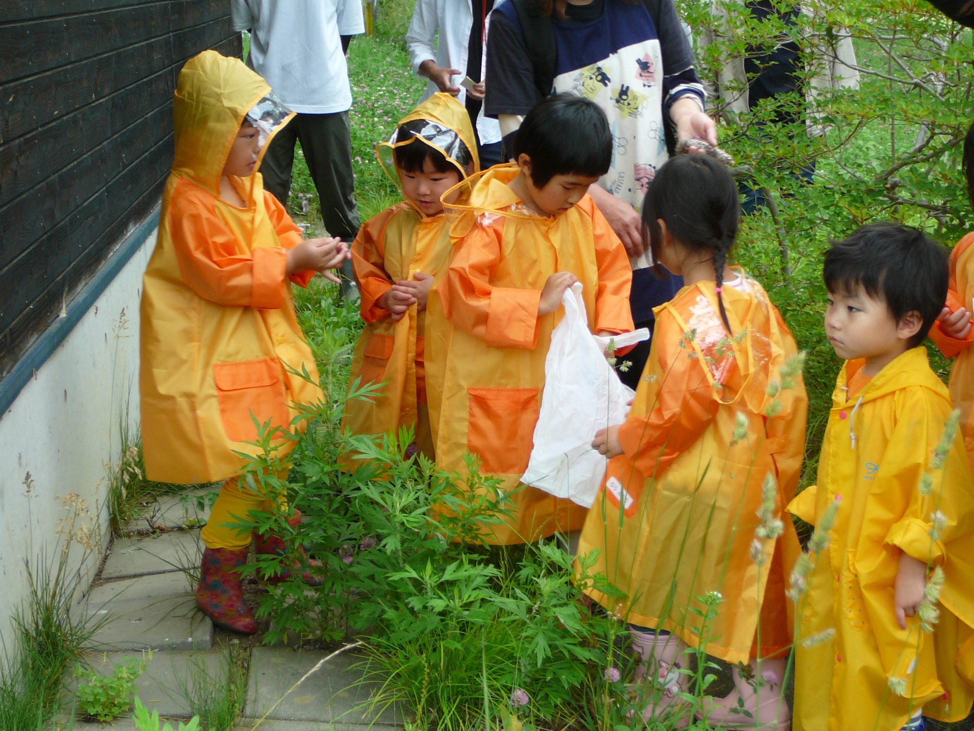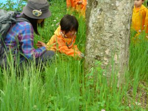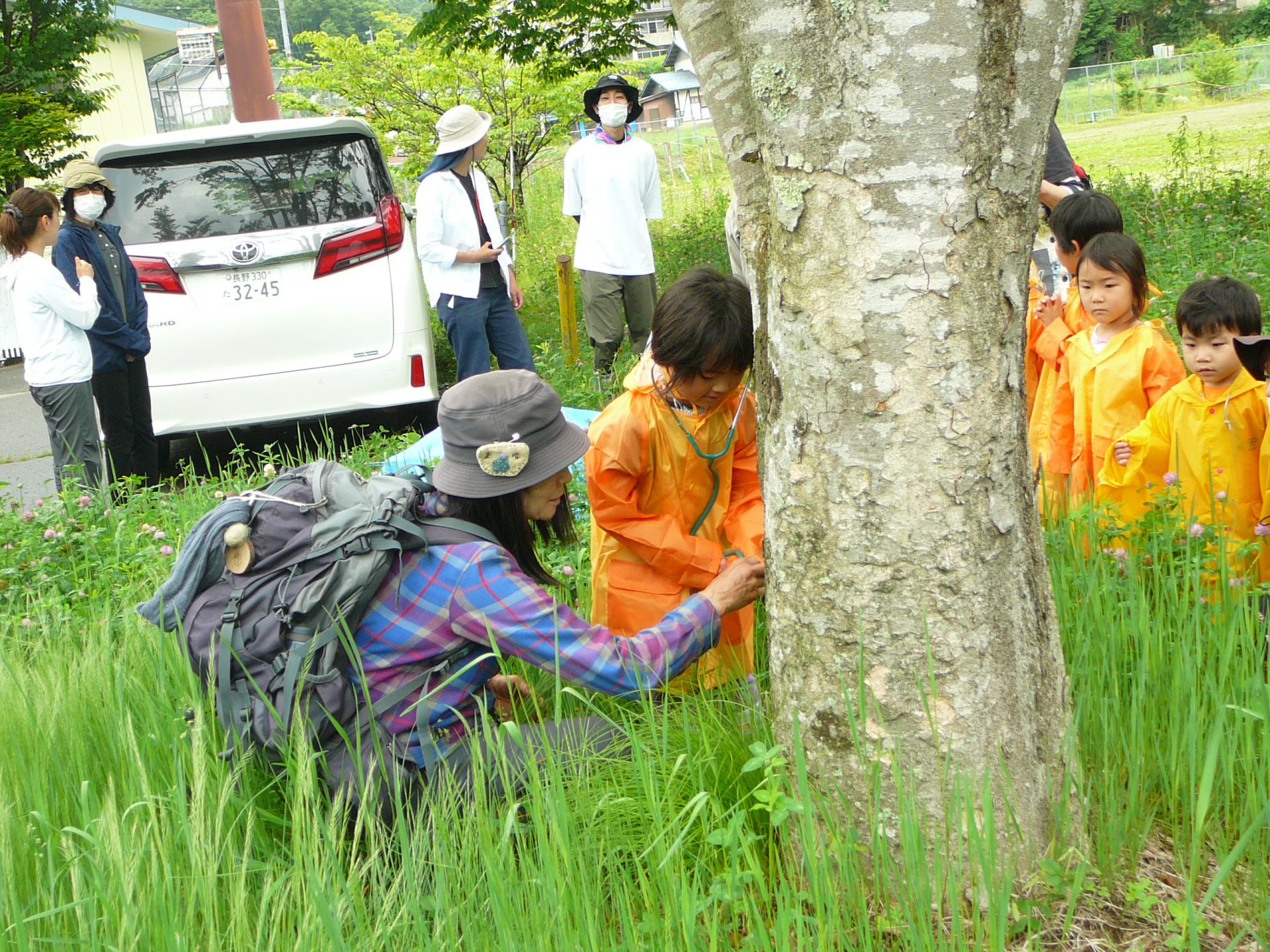 カッパを着て出かけると、まゆさんが「木が水を吸う音が聞こえるよ」