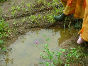 いつも遊んでいる支所裏に来ました。朝まで雨が降っていたので水たまりもあります。