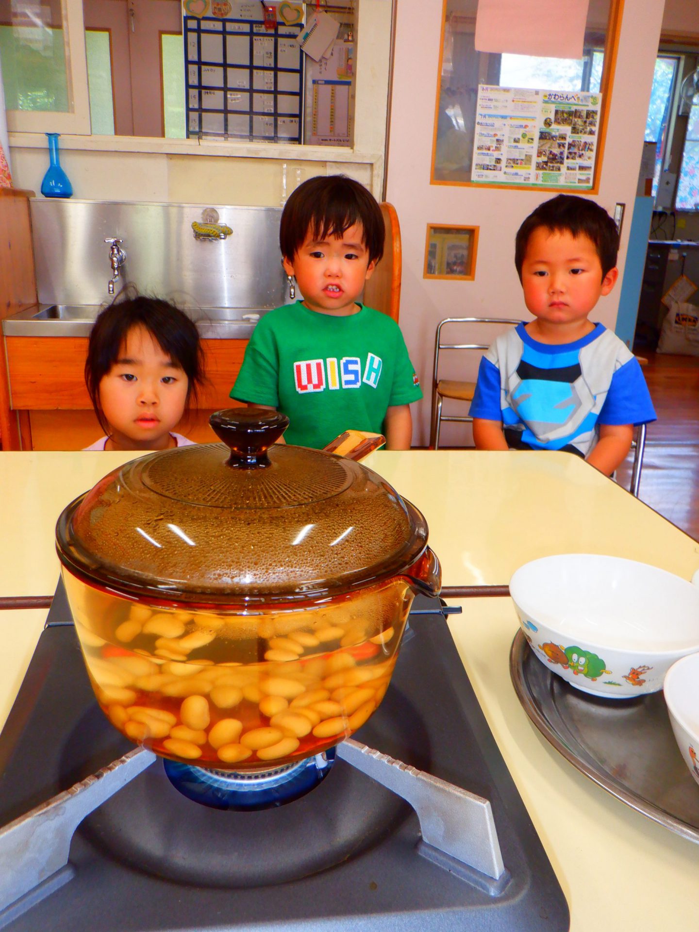 3時間以上煮た豆は茶色に色が変化して、おいしい匂いが立ち込めます。