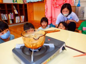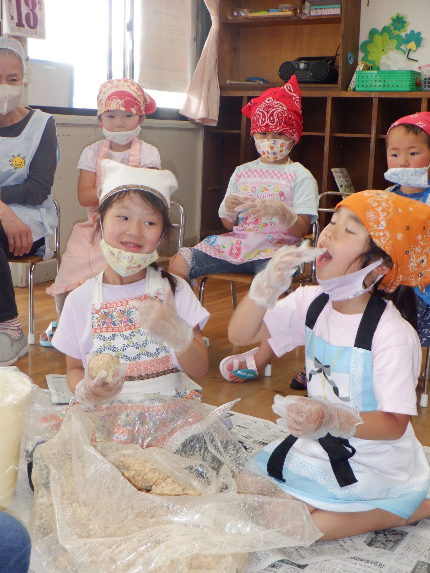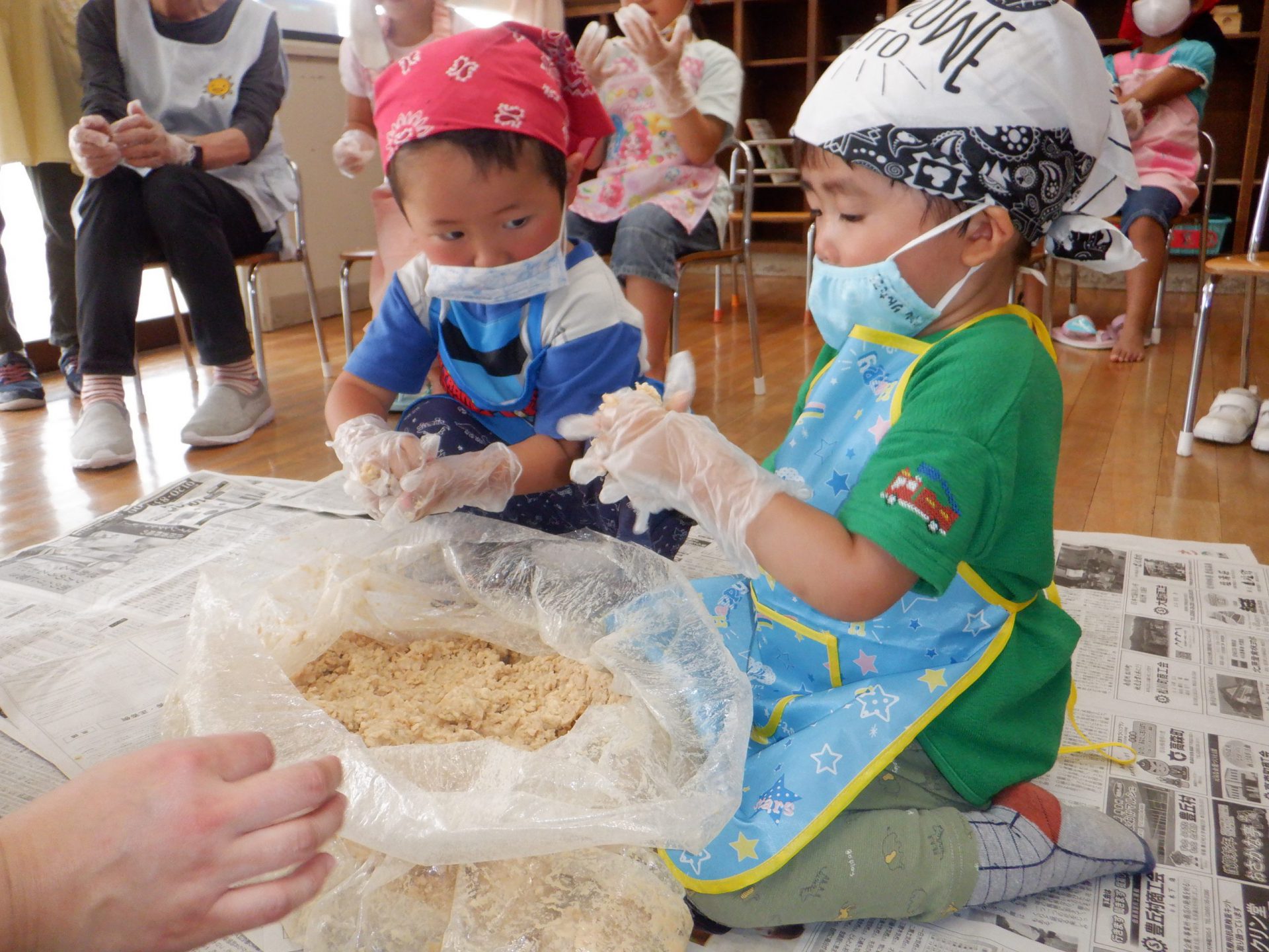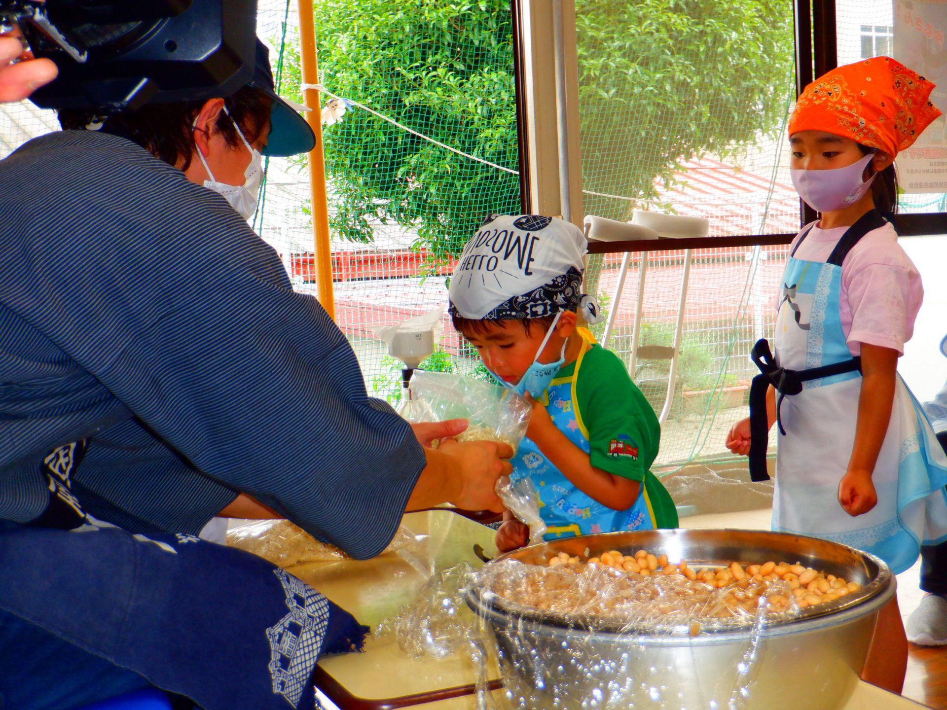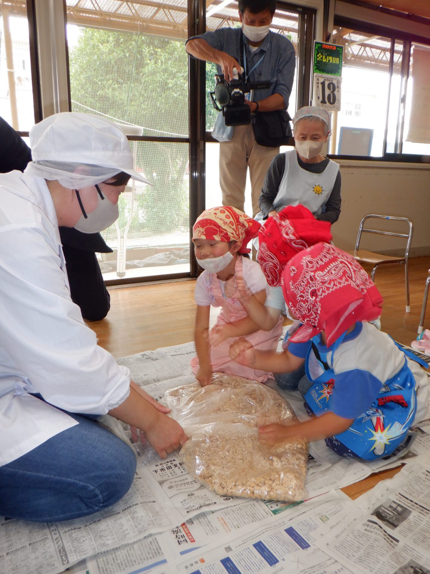 ・まる一日の味噌作りでしたが、意欲的に活動することができました。昨年までの経験がある子たちは大豆が味噌になることや味噌作りの作業の工程も覚えていて、「次はこうだね。」などとより活動に楽しみが持てているように感じ、子どもにとって難しいこともあるが経験したことで興味関心が深まっていることを感じ、実体験することの大切さを感じた。