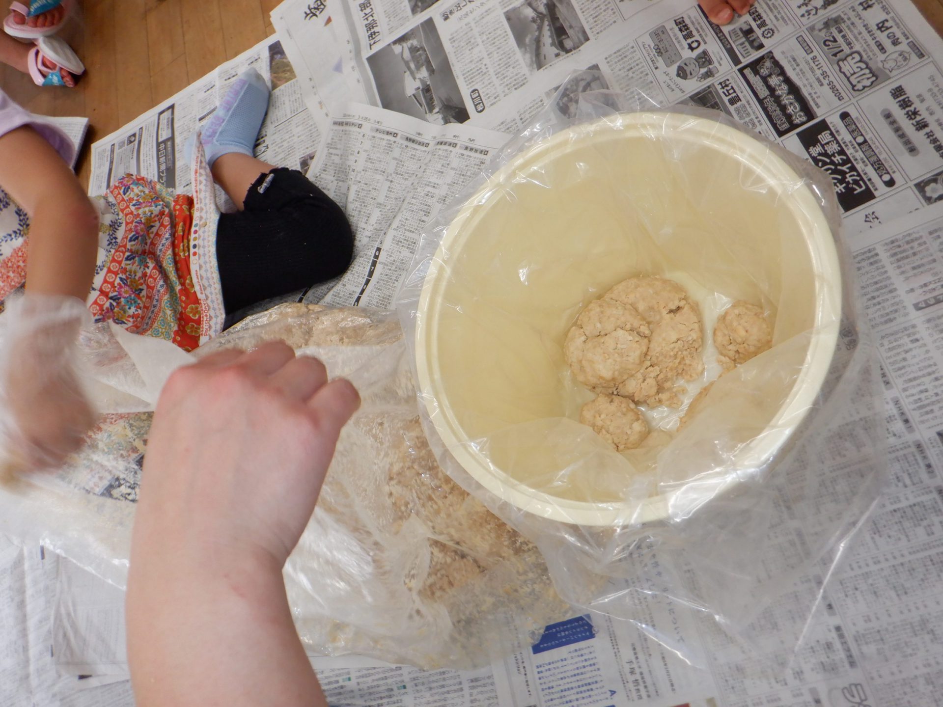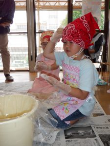 しっかり混ざるように子どもたちも一緒にこねていきます。