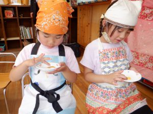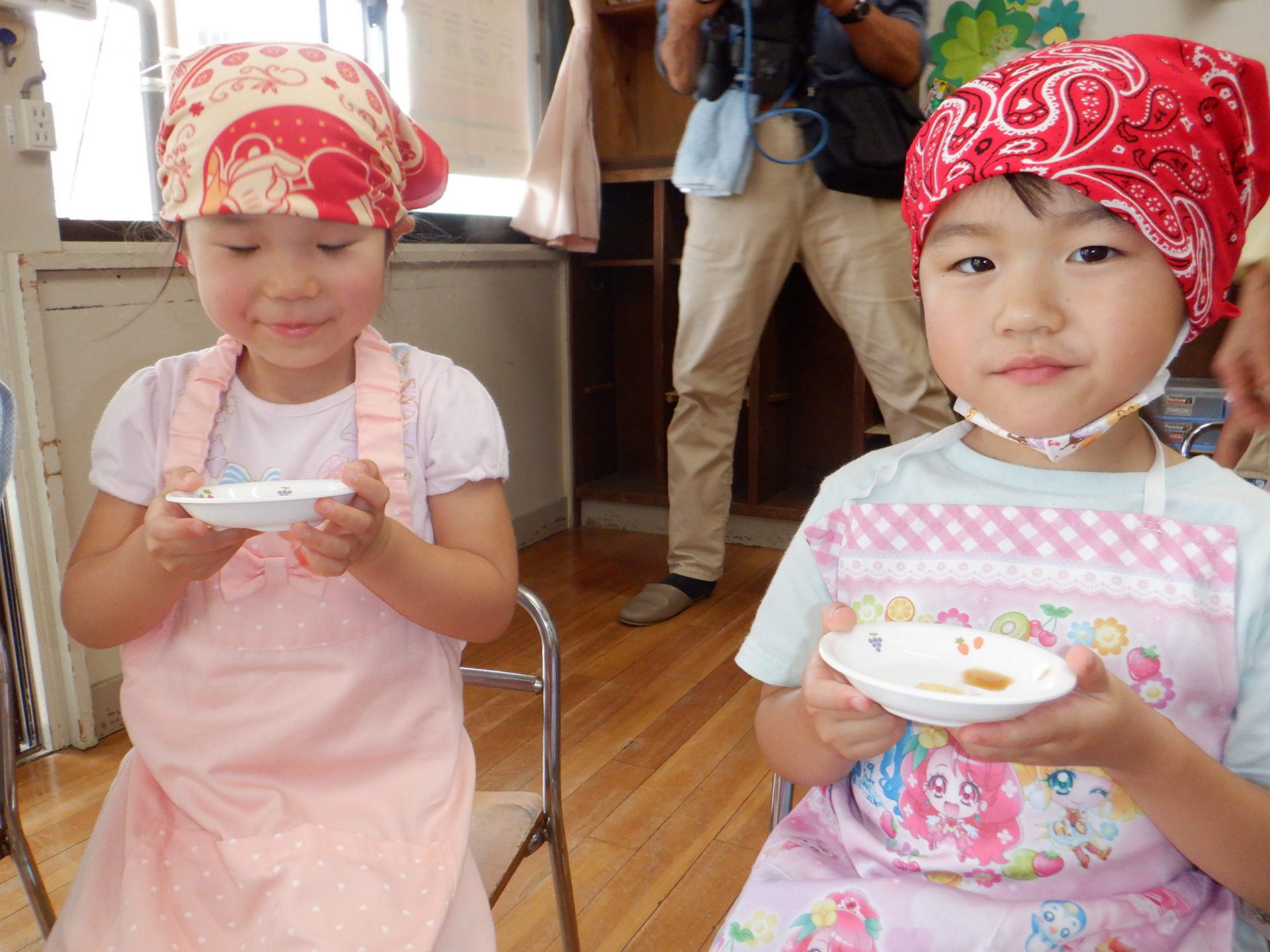 午前中は「てまえみそのうた」という絵本と「パネルシアター」で味噌作りについて学びました。