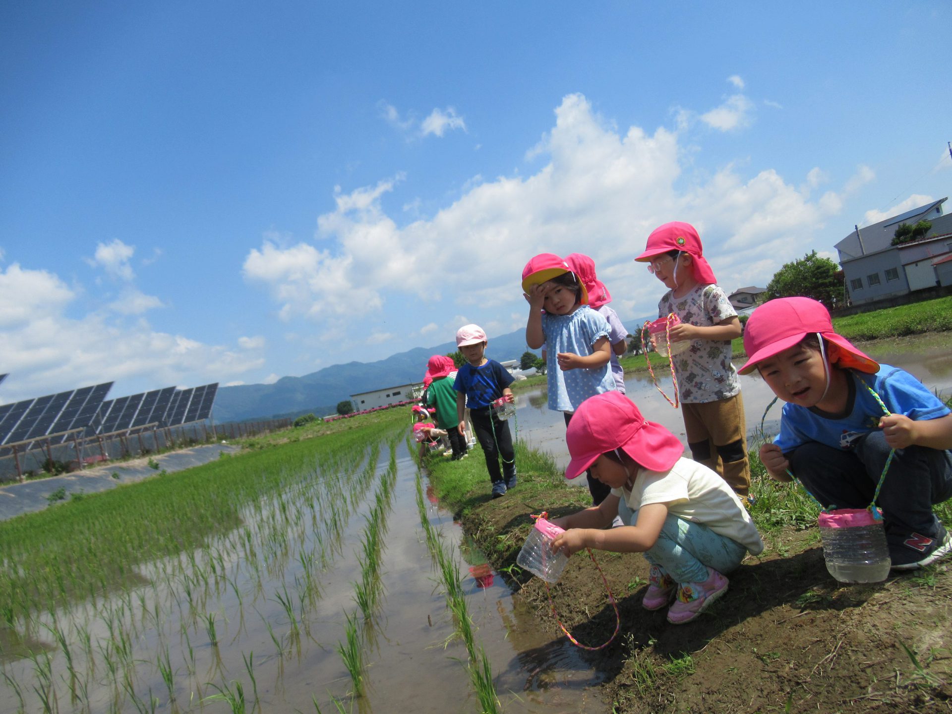園の近くの田んぼで、オタマジャクシやヤゴ、エビを見つけ、田んぼに足やお尻を落としながらも。。。夢中で捕まえました。