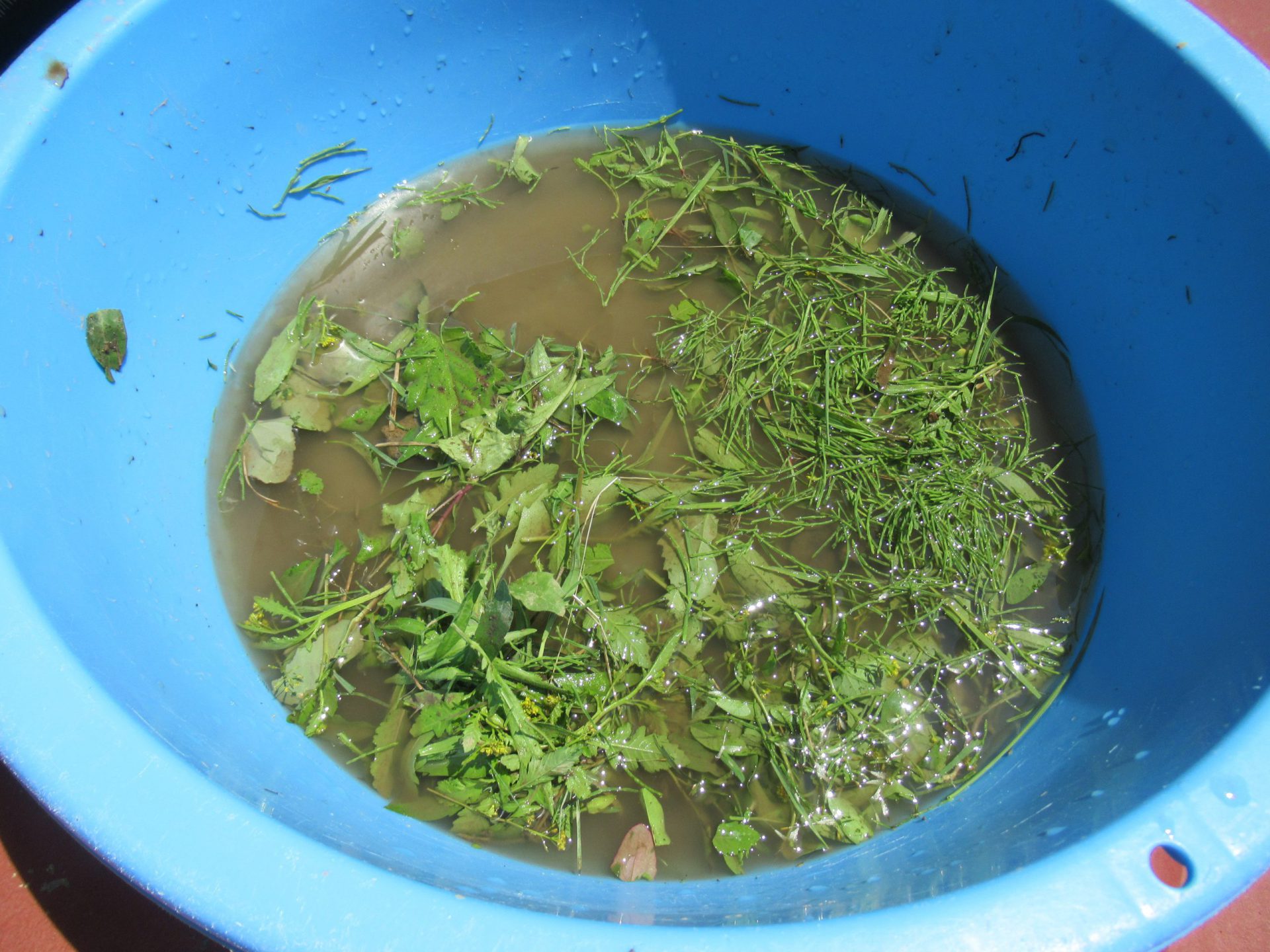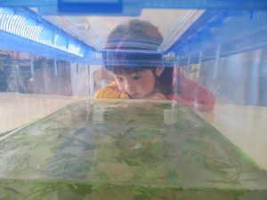 「オタマジャクシやヤゴの餌は、草だよ!」と言って、たくさん草をあげていた子どもたち。翌日。。。草が減っていなくて、不思議に感じた子ども達は、みんなで図鑑を見ました。煮干しを食べると分かり、給食室から煮干しをもらってオタマジャクシにあげました。そして。。。水槽が臭い「せんせい!たいへん!オタマジャクシがおならした!!」と真剣に匂いを嗅いだり覗いて観察をしていました。