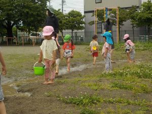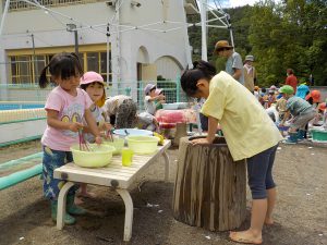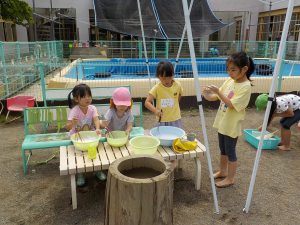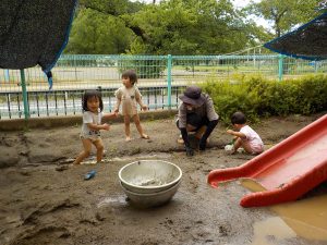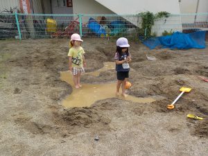 1歳児のみんなも泥遊び。「バシャバシャ」