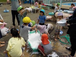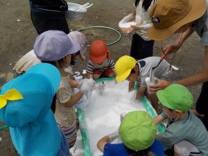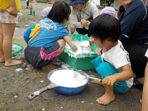 洗面器に泡を入れて泡立てで「シャカシャカ」とさらに泡立てます。年少さん、年中さん、年長さん、みんな夢中です。