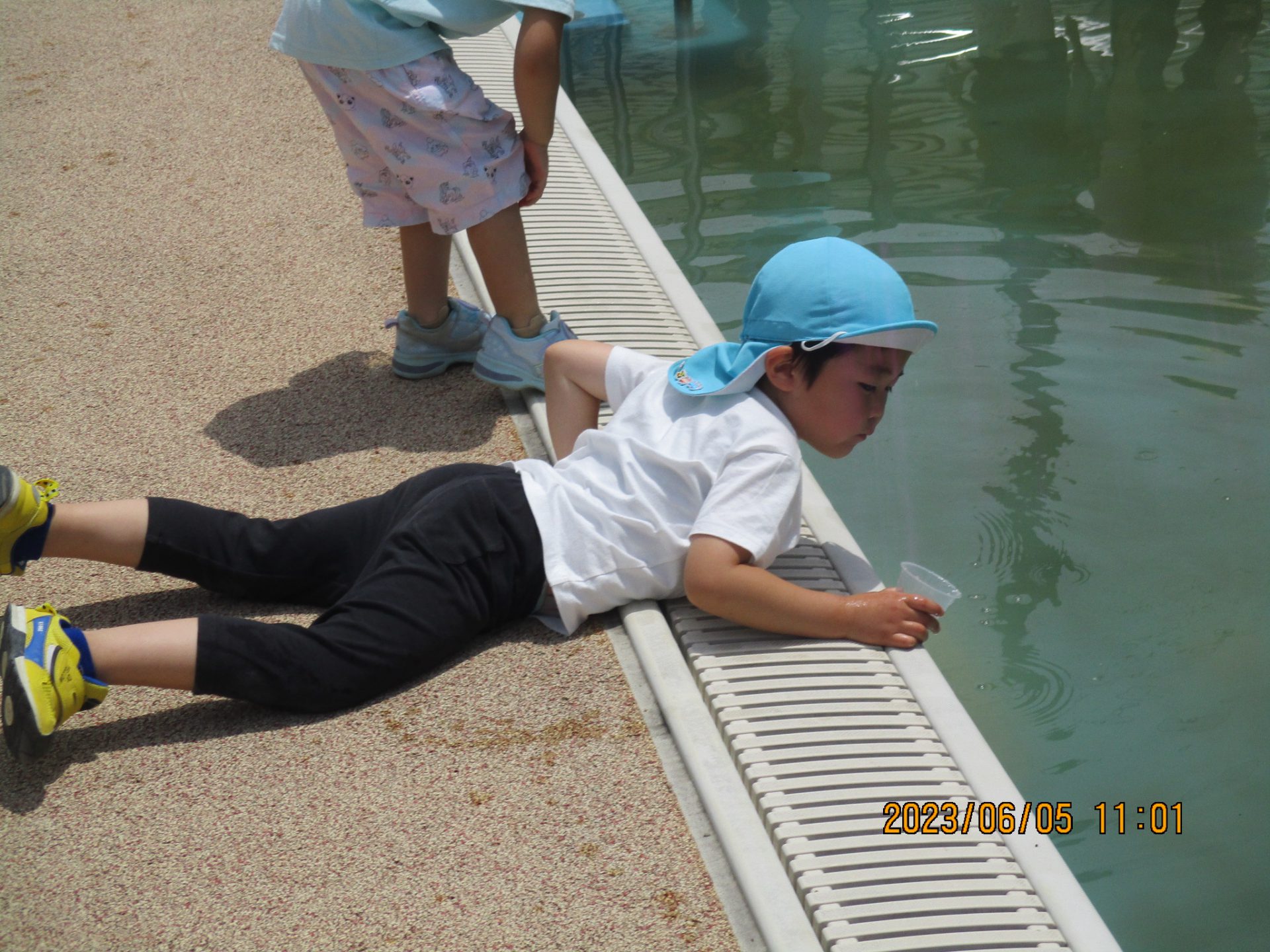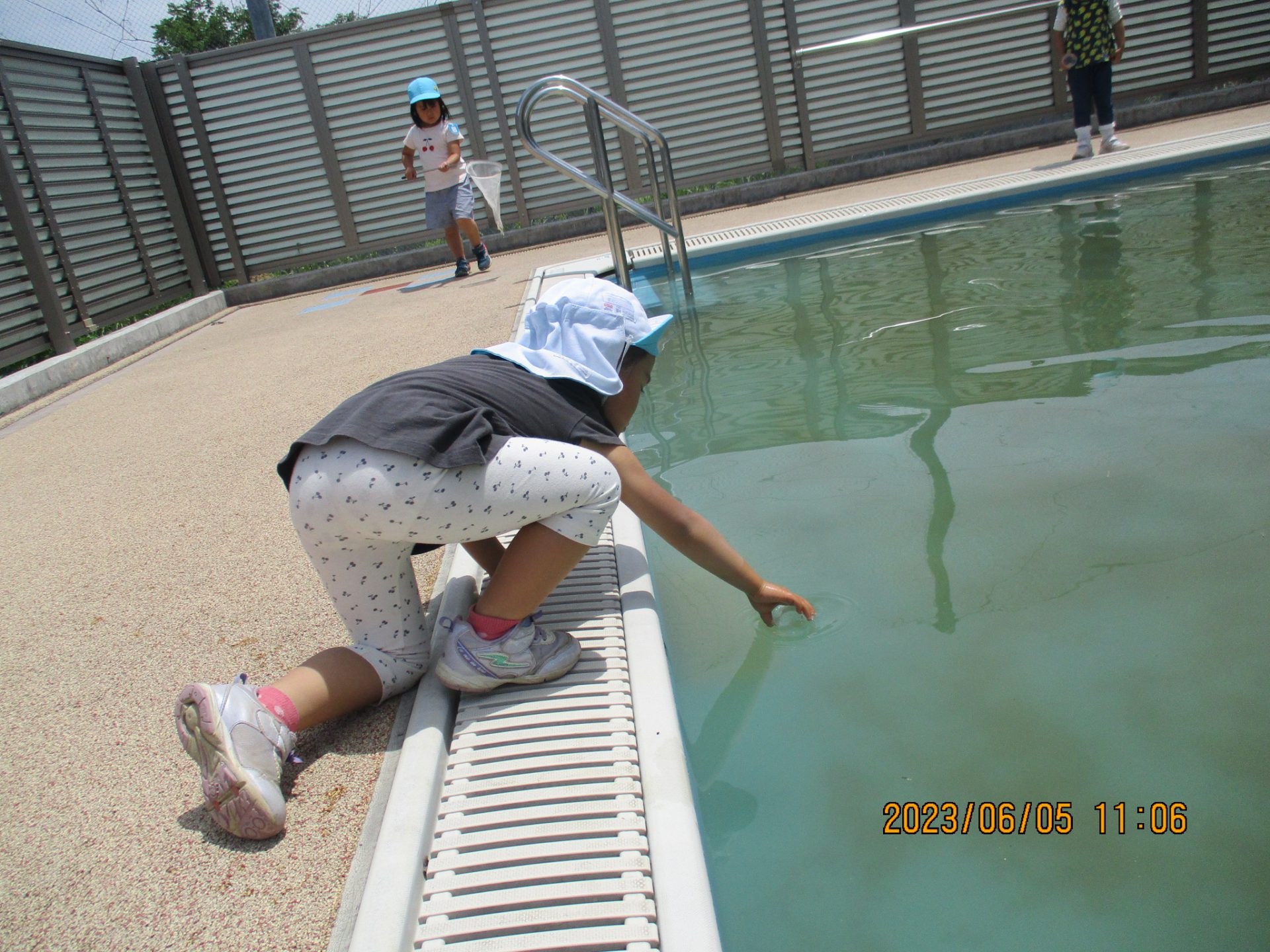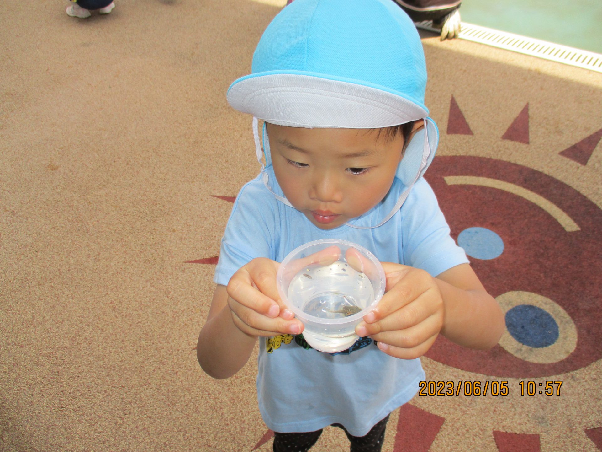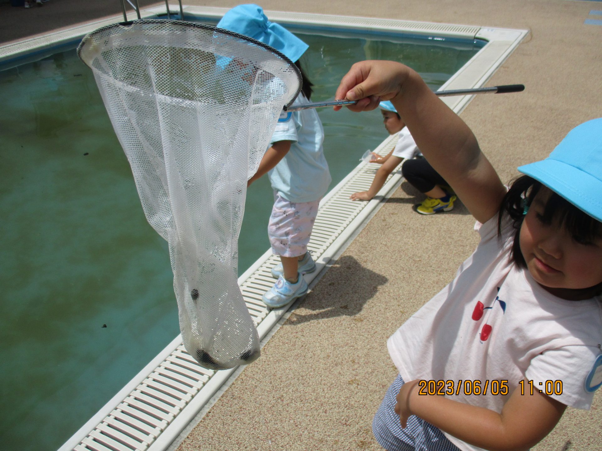 年少の時、おたまじゃくしがプールにいるのを見た、年中ぱんだぐみさん。