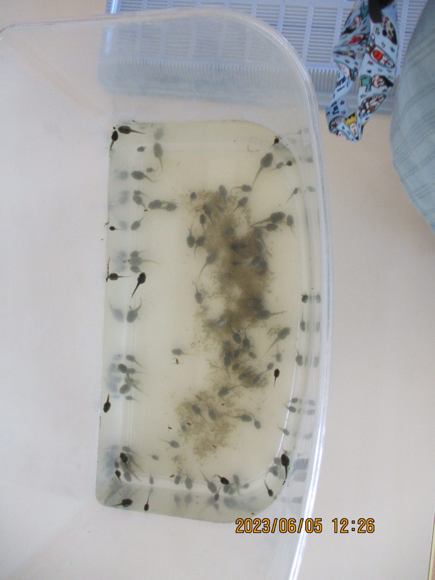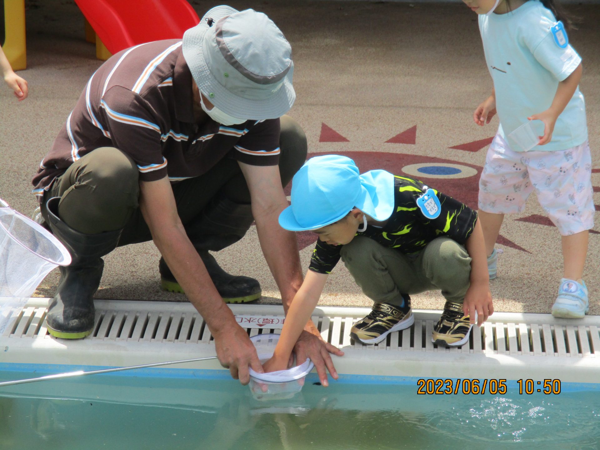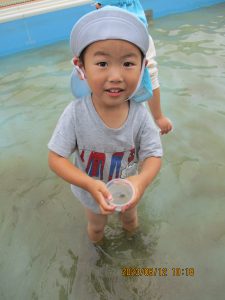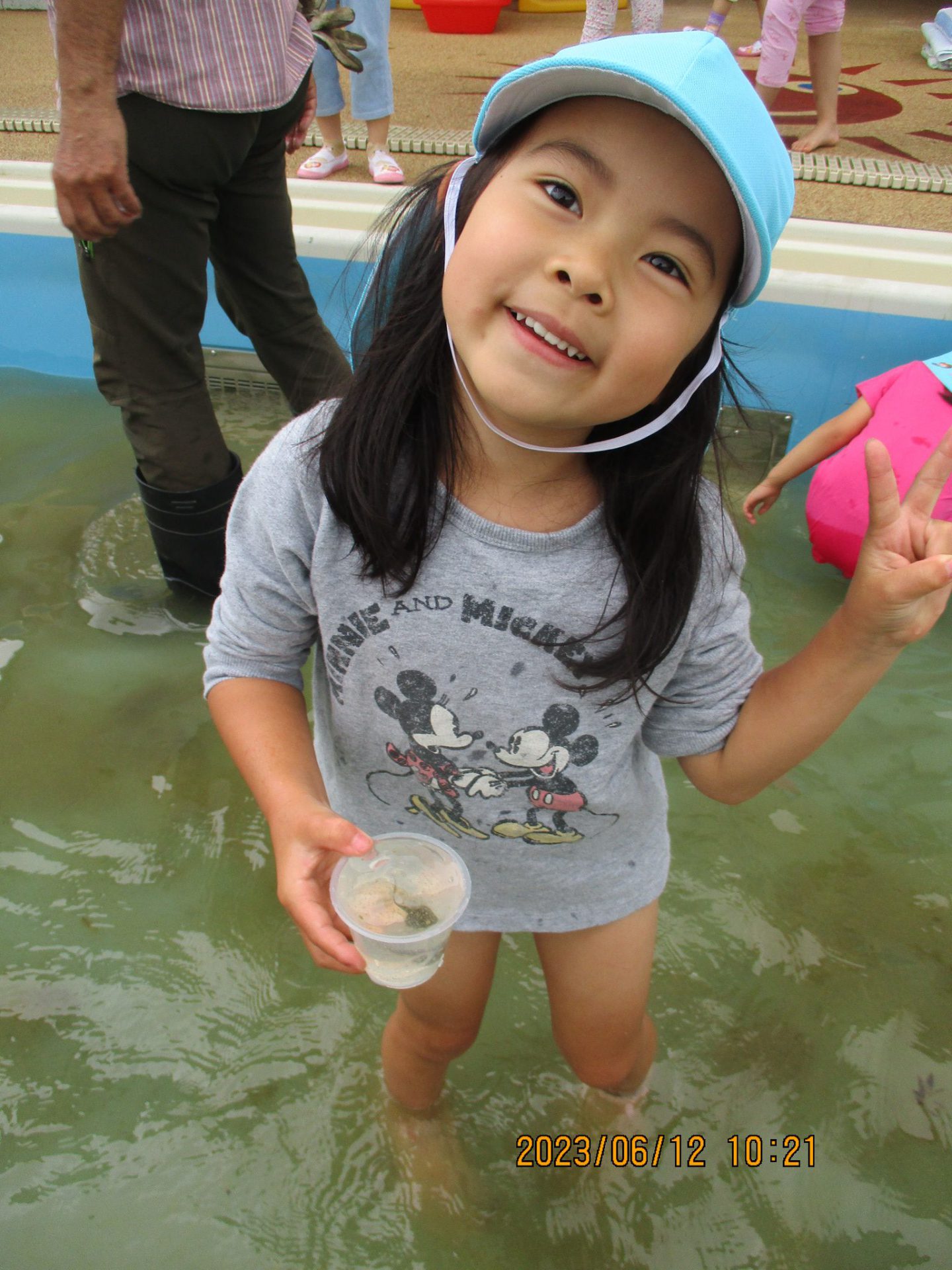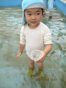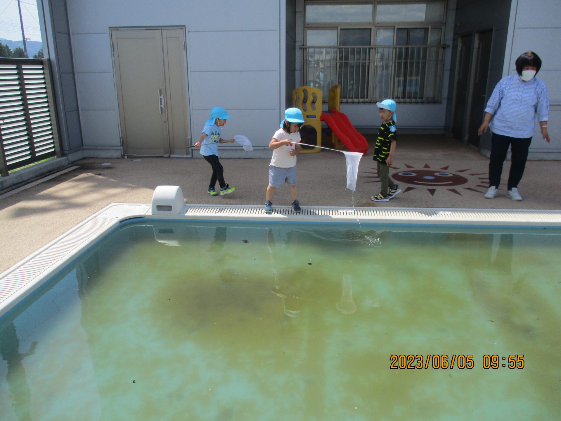 年少の時、おたまじゃくしがプールにいるのを見た、年中ぱんだぐみさん。