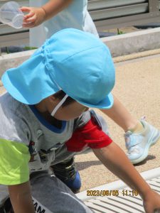 昨年度、プールにおたまじゃくしがいて、つかまえた事をしっかり覚えていた子どもたち。いつになったらおたまじゃくしがプールにあらわれるのか、毎日気にかけ、見に行っていました。