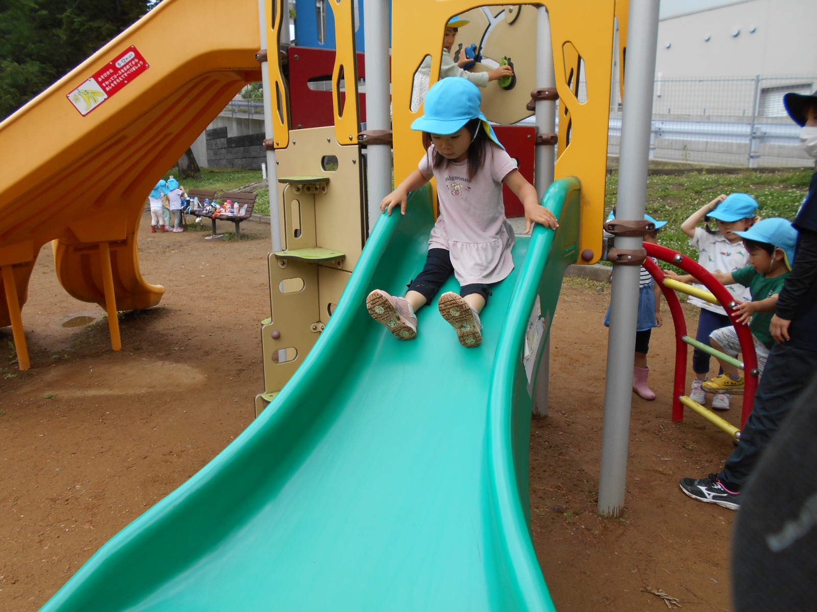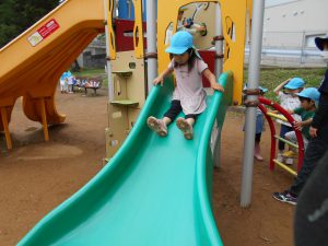 大好きな滑り台を滑るために一生懸命全身の力を使って登ります。