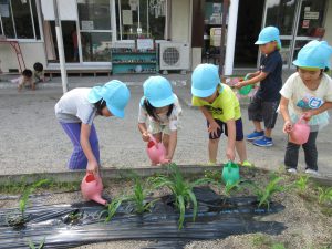6月になるとさつまいもの苗を植えました。このころには野菜にとても興味をもっている子どもたちだったので、進んで苗を植えてくれました。暑い日にもがんばって水やりや草取りをやってくれています!