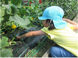 畑や園庭に夏野菜を植えました。種をみて「これが野菜になるの?」と半信半疑な子どもたちでした。毎日、水やりをして芽がでてくると子どもたちも嬉しくなり、生長を楽しみにするようになりました。芽が出てきて、葉ができると「これはトマト、これはきゅうり・・・」と種類を確かめ、だんだんと野菜に興味をもち、「今日は水やりの日?」と進んで野菜を育ててくれるようになりました。いよいよトマトができ始めると「先生!トマトできてるよ!!!!」とキラキラの笑顔で報告にきてくれました。