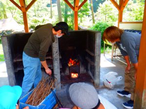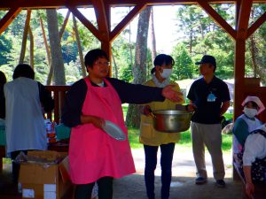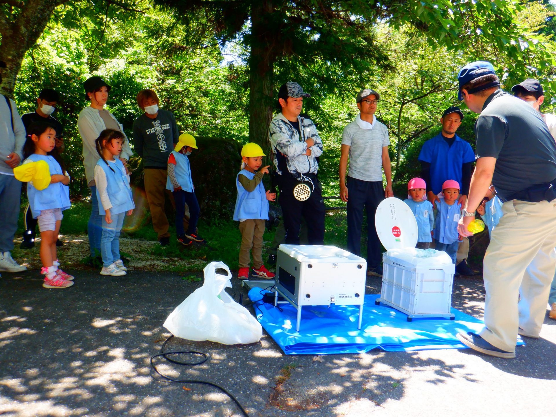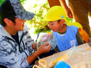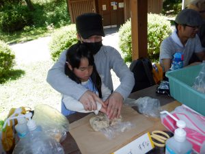 親子で防災について学ぼうと、飯田短期大学の高木先生と「食と防災サークル」の学生さん、市役所危機管理課の後藤さんを講師にお呼びし、妙琴公園で体験をしました。 防災について学ぼう①「パッククッキング」