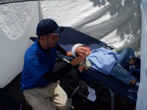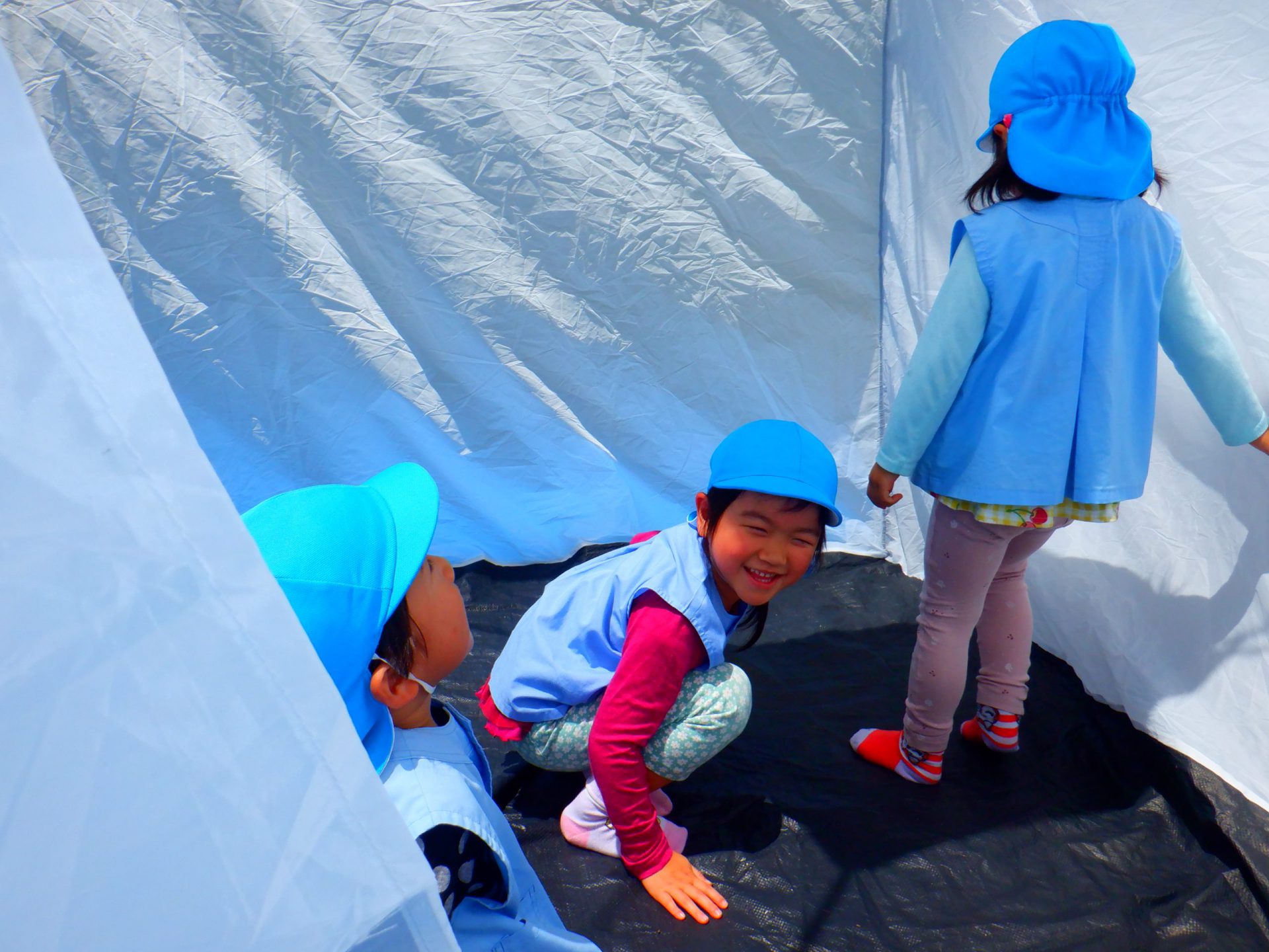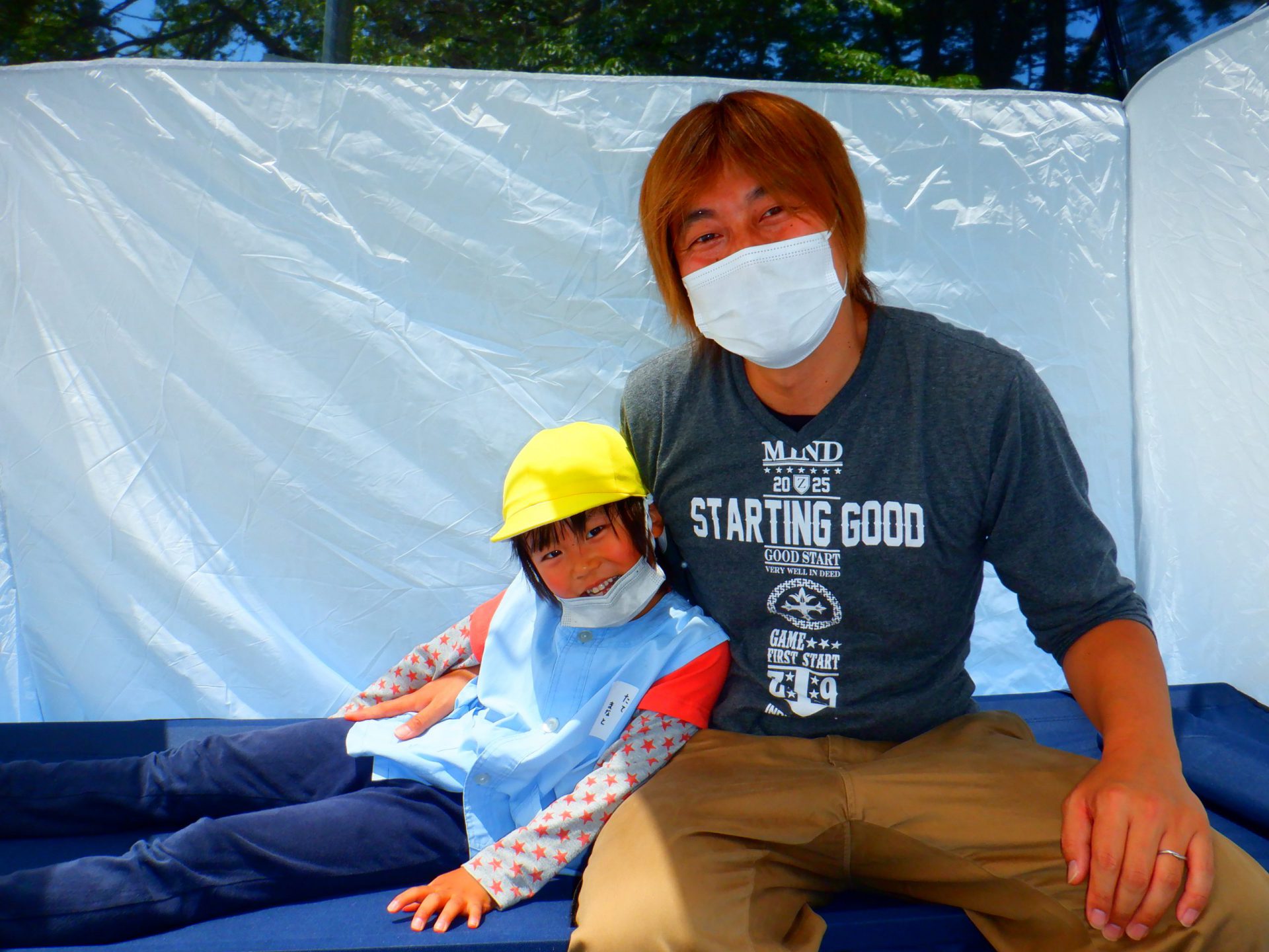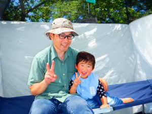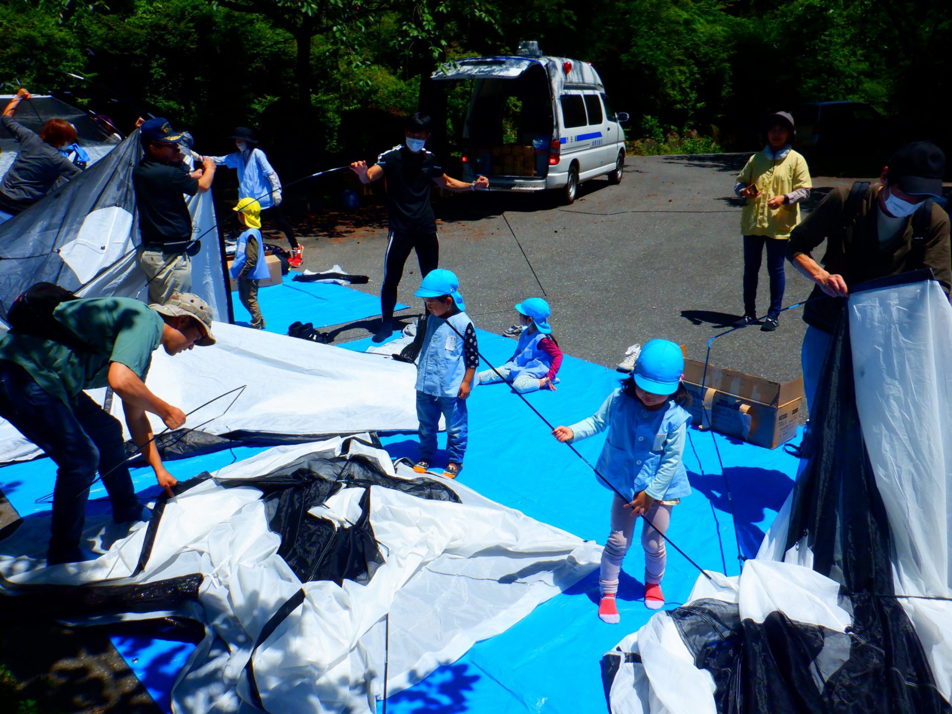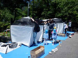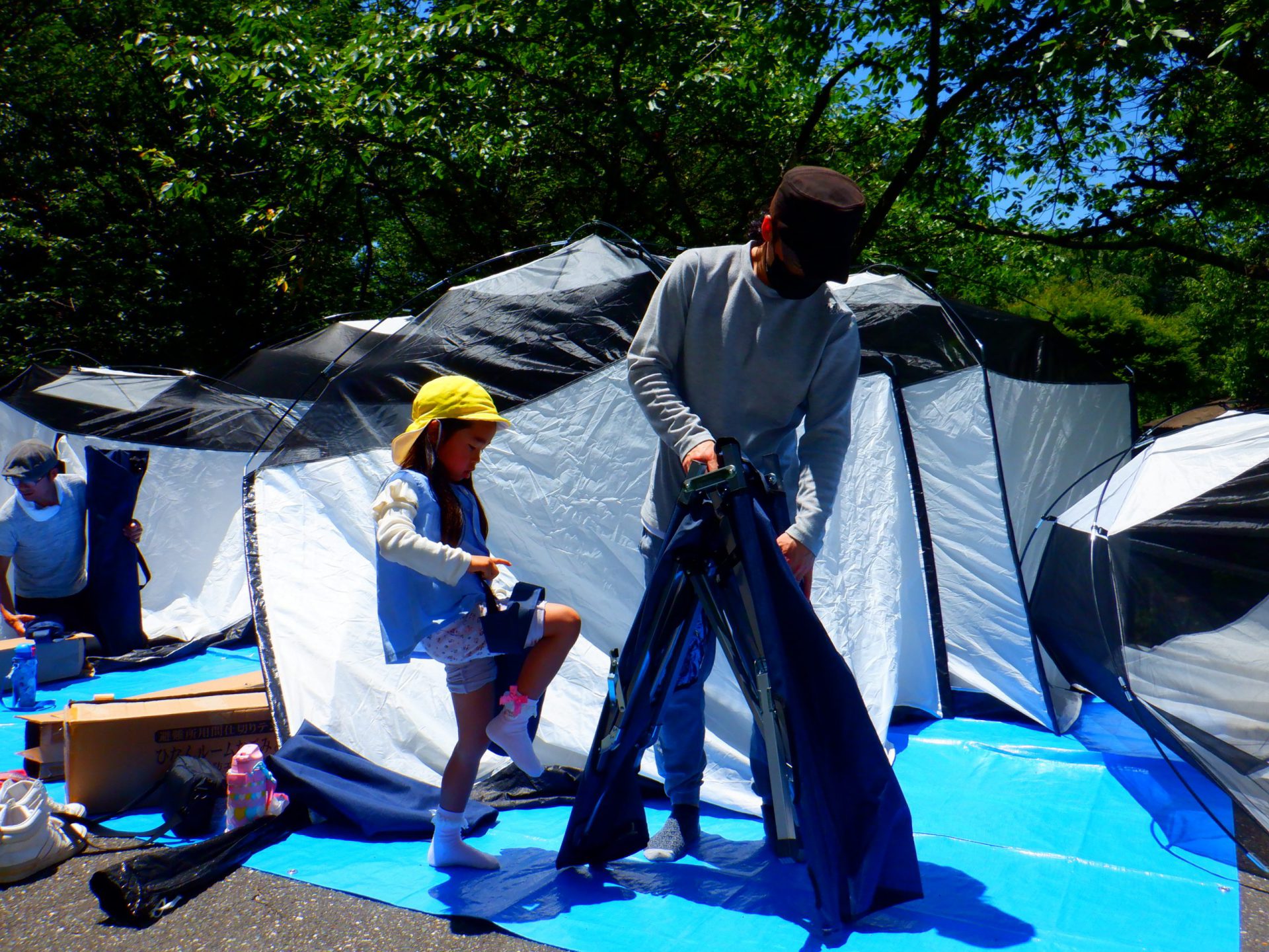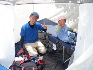 テントが完成し、簡易ベットも入って親子でハイポーズ! がんばりました。