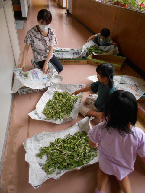 毎日のお世話も大変だけど、自分の遊びより前に「あ、蚕のお家をきれいにしてあげないと」といつでも気にかけている姿が見られます。
