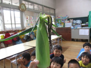 登園し、発見した子が「あっ!やったー!今日のおやつ、もろこしだ!」とみんなに知らせてくれました。