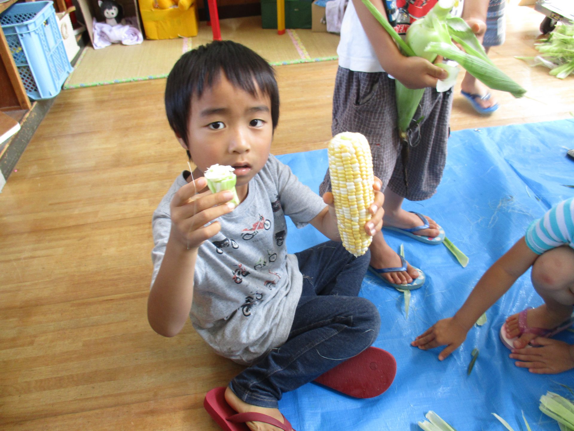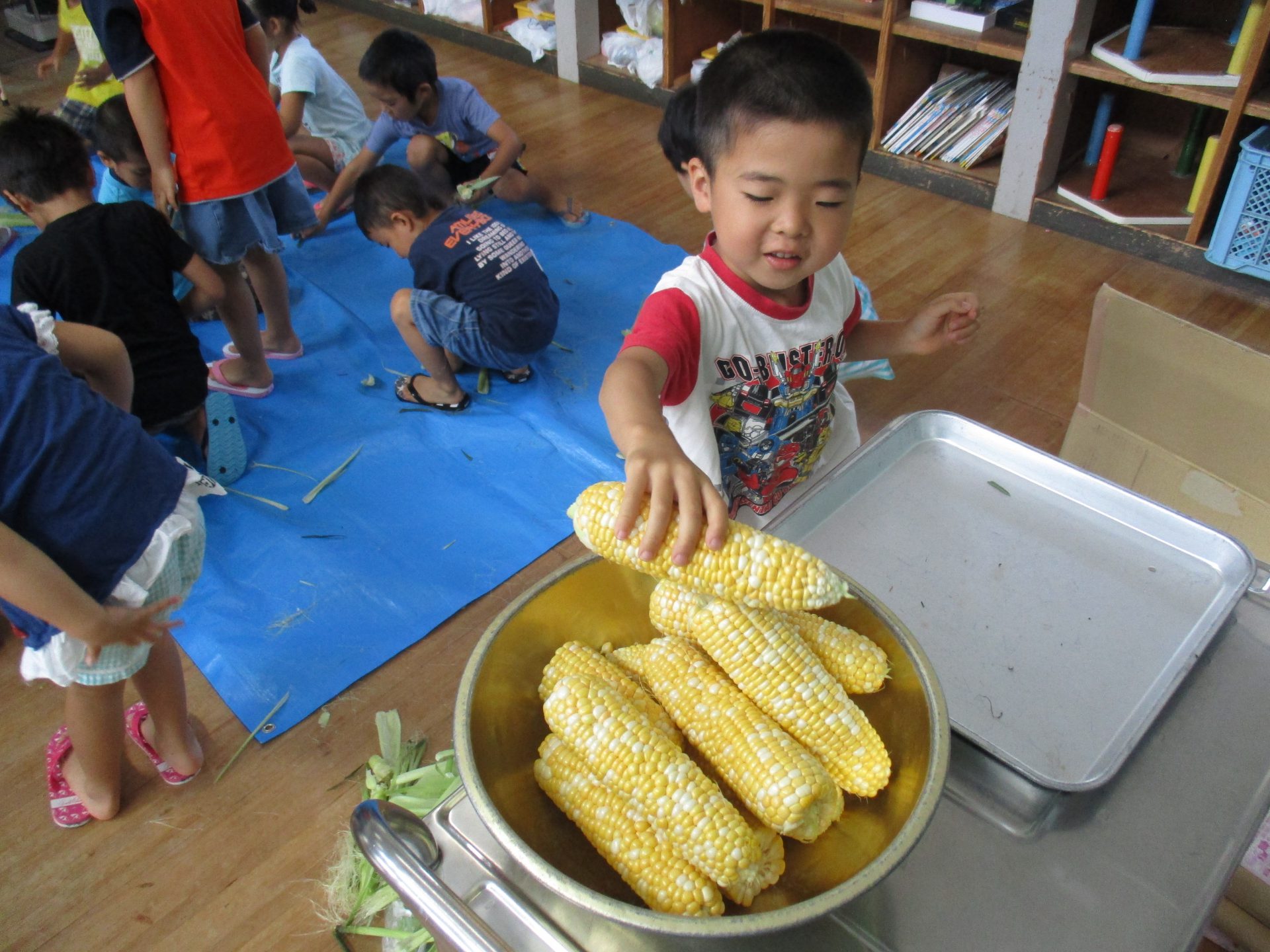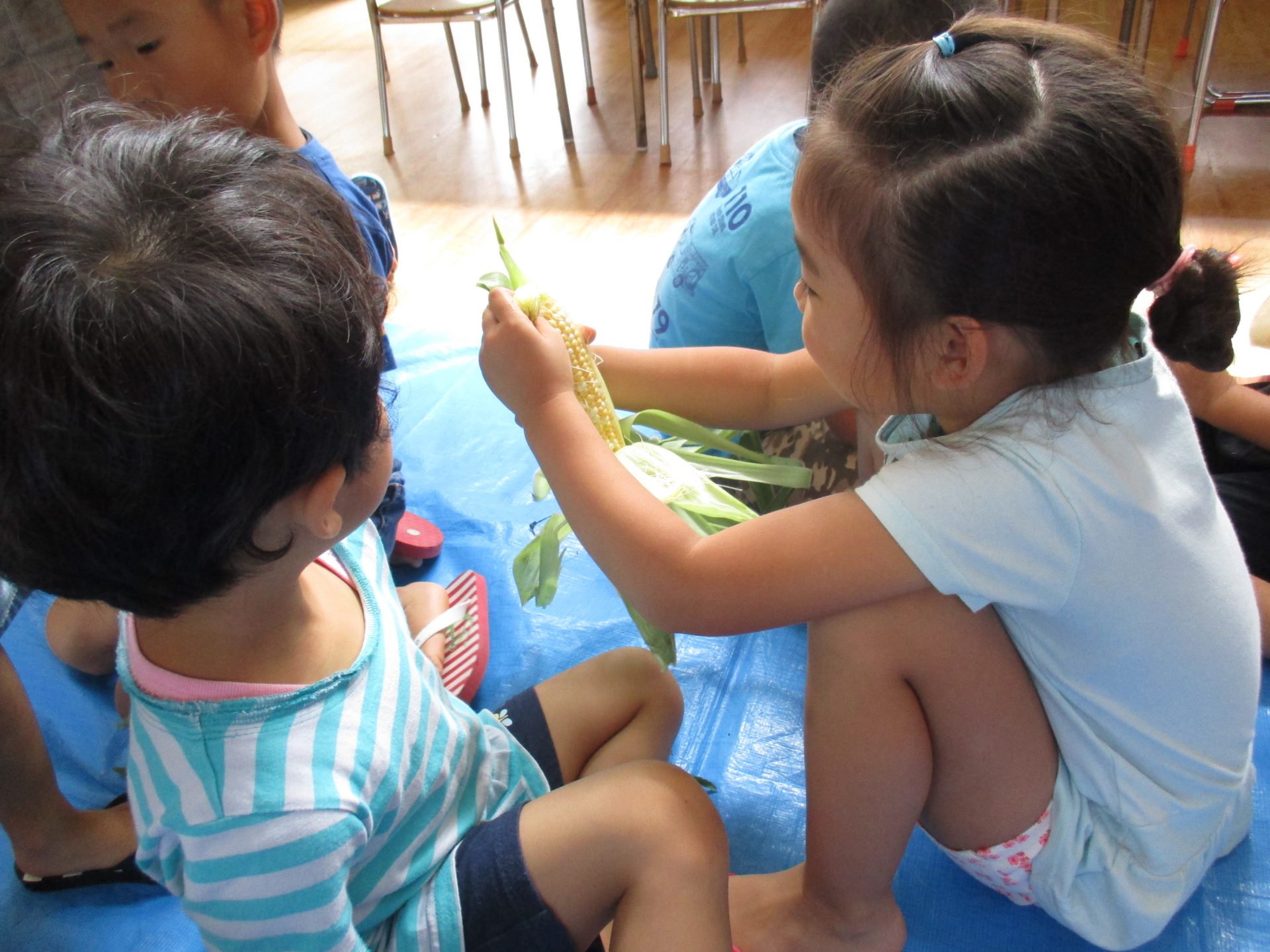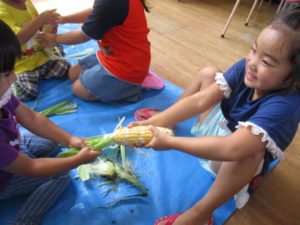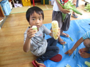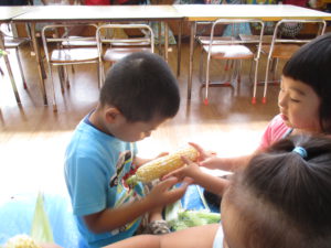 この時期ならではの食材、地元で採れるトウモロコシはとっても甘く、子どもたちは大好きです。おやつに食べるトウモロコシを自分達で皮をむいて準備することでいっそう食べるのを楽しみできたと思います。