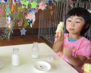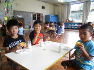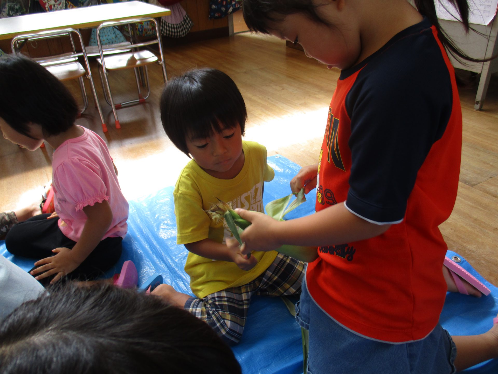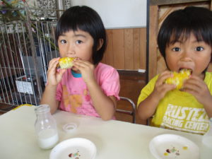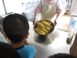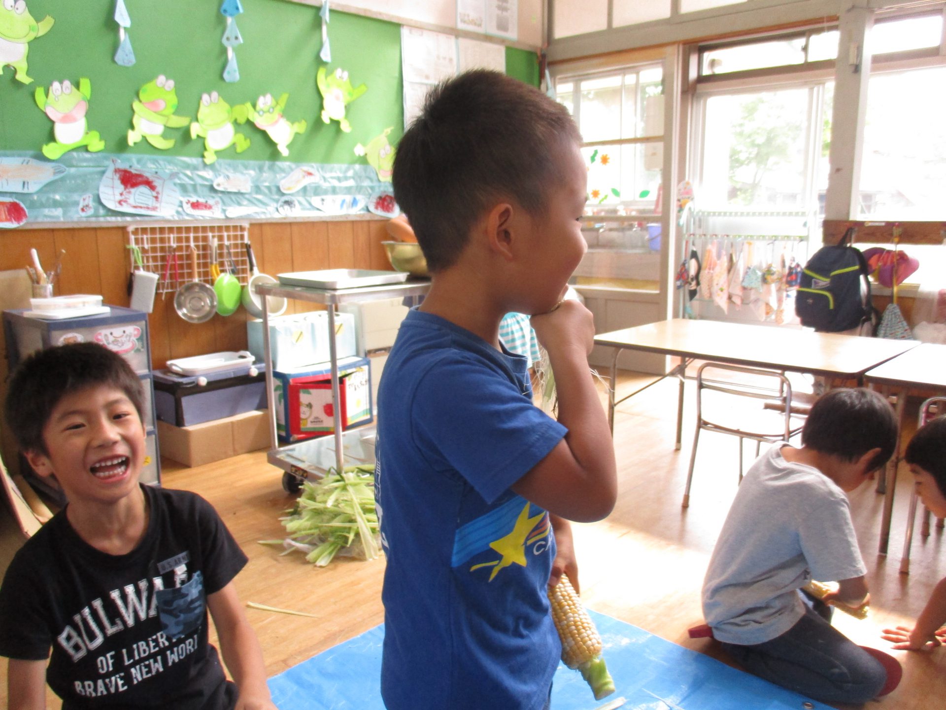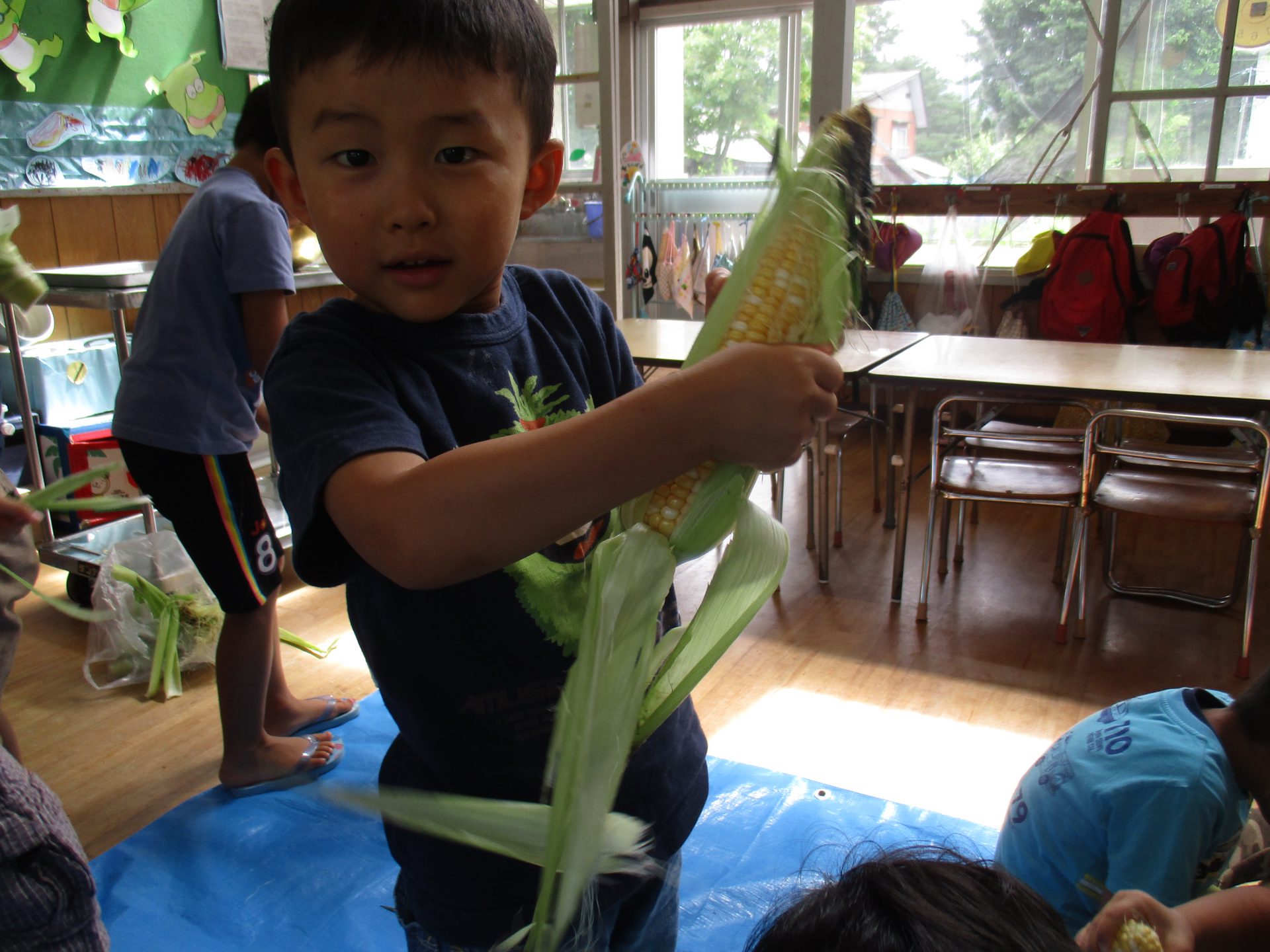 この時期ならではの食材、地元で採れるトウモロコシはとっても甘く、子どもたちは大好きです。おやつに食べるトウモロコシを自分達で皮をむいて準備することでいっそう食べるのを楽しみできたと思います。