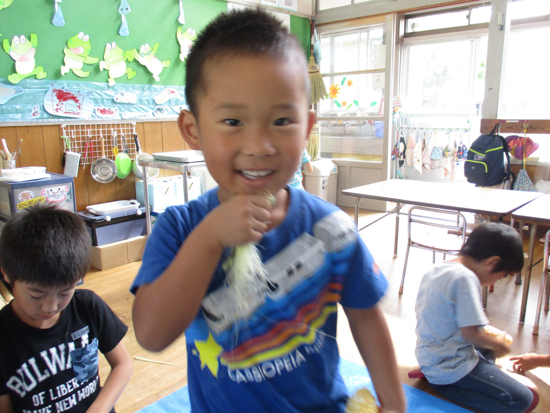 子どもたちに聞いてみると全員が家でもトウモロコシの皮むきを経験していました。それほど信濃町の夏といえばお馴染みの食材です。子どもたちには小さいうちから地元の特産品に触れて、味わって、もっともっと好きになって欲しいです。またおやつにトウモロコシが出る日が楽しみです。