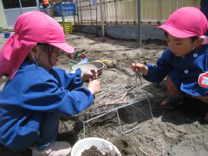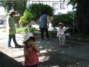 お休み明けでしたが、戸外に出ると目を輝かせながら園内や園周辺を散策したり、自分が経験したことを遊びの中に取り入れて友達とごっこ遊びを楽しむ姿が見られました。