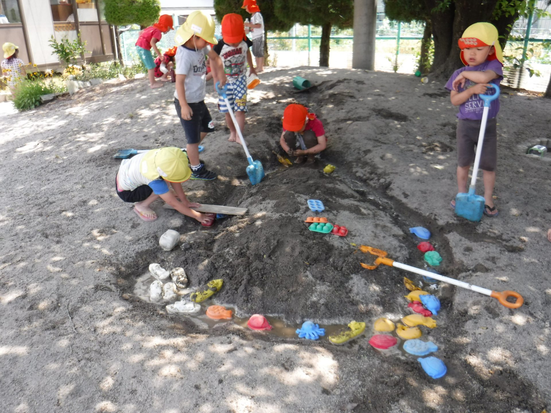 木陰の砂山に、子どもたちがバケツやタライに水を溜めて、お友だちと力を合わせて運びます。