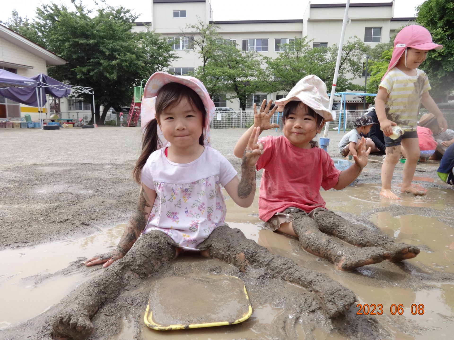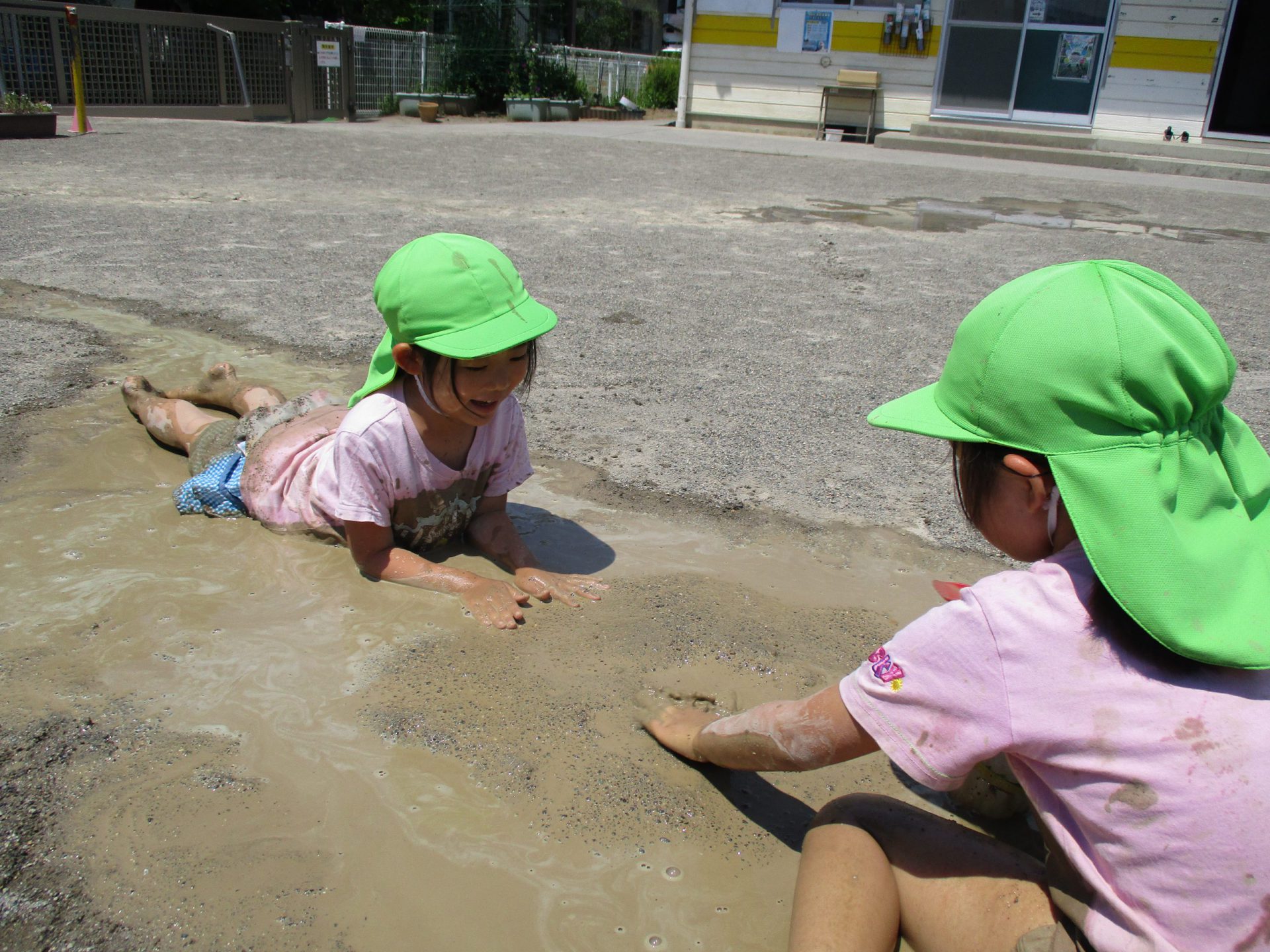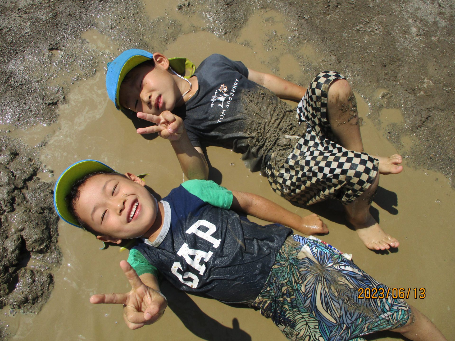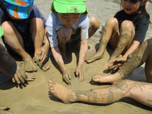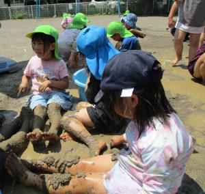 手や足だけでなく、体全体で泥の感触を味わっていました😊