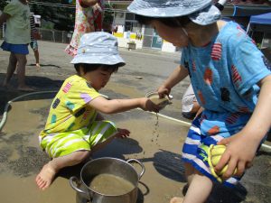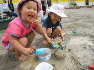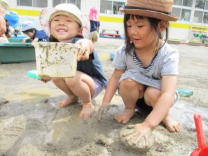 ・泥遊びを始めた頃は恐る恐る泥に触れ、汚れることに抵抗がある子どももいました。友達の泥遊びの様子を見たり、裸足で水や泥に触れたりしているうちに少しずつ泥遊びに慣れ、全身で泥遊びを楽しむ姿が増えました。