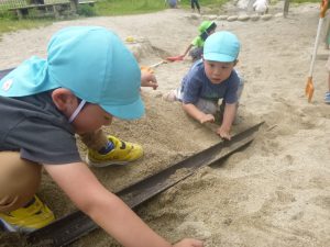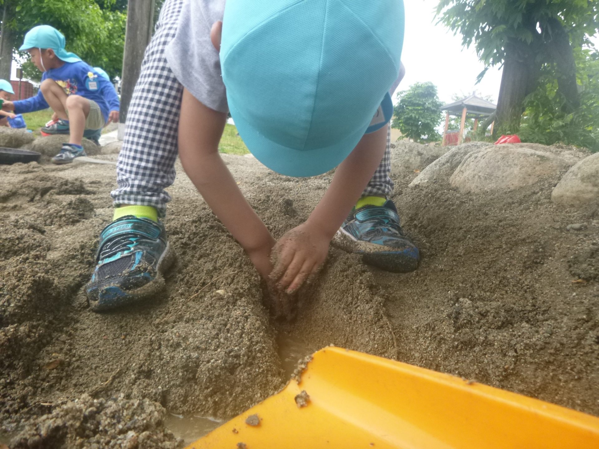 雨上がりの砂場は最高の遊び場。「ぼくたちのまちを作るんだ!」みんな張り切っています。