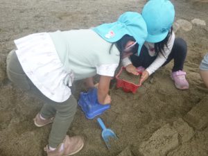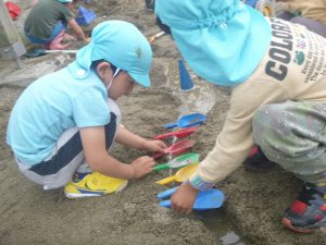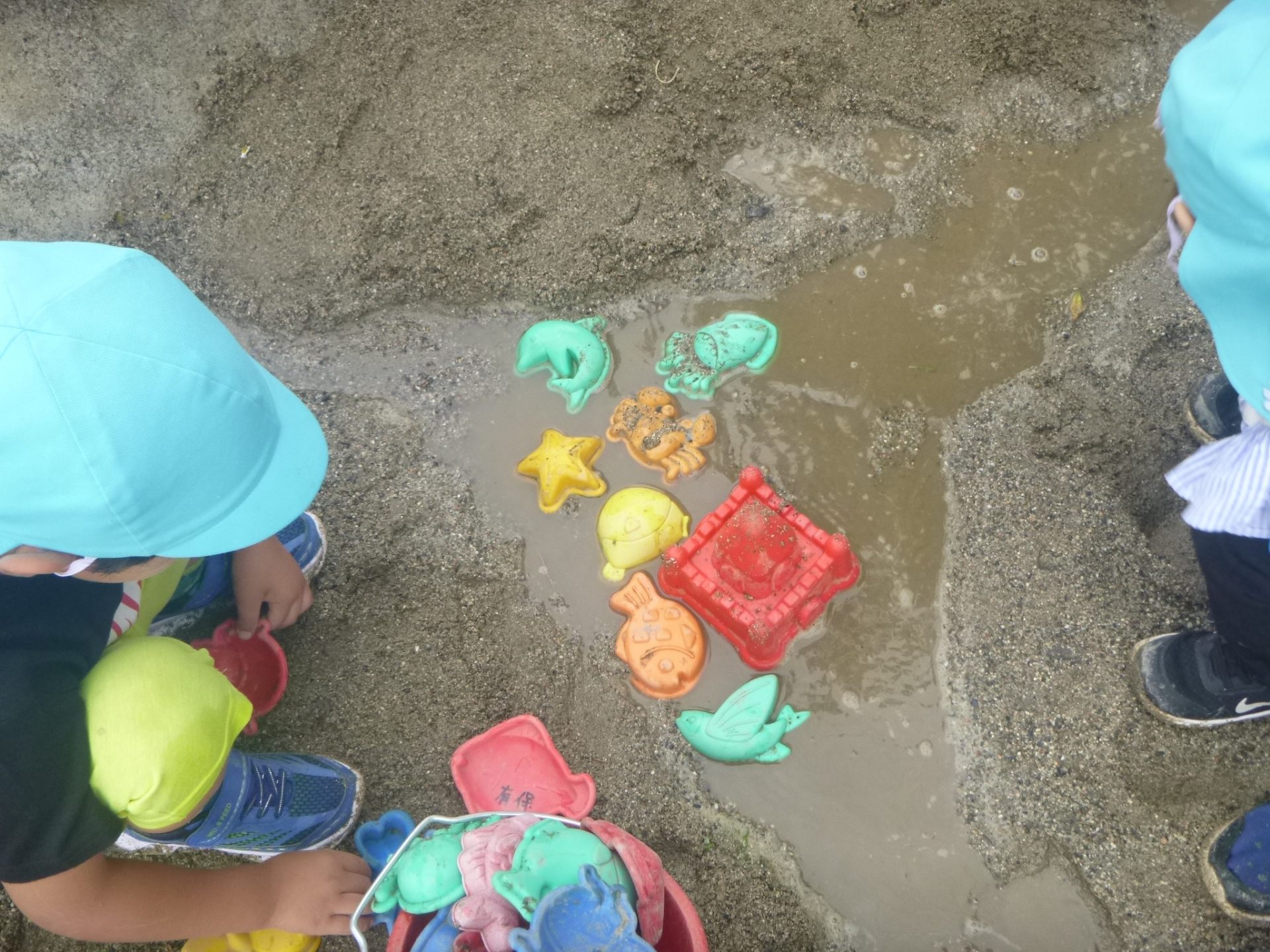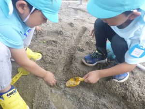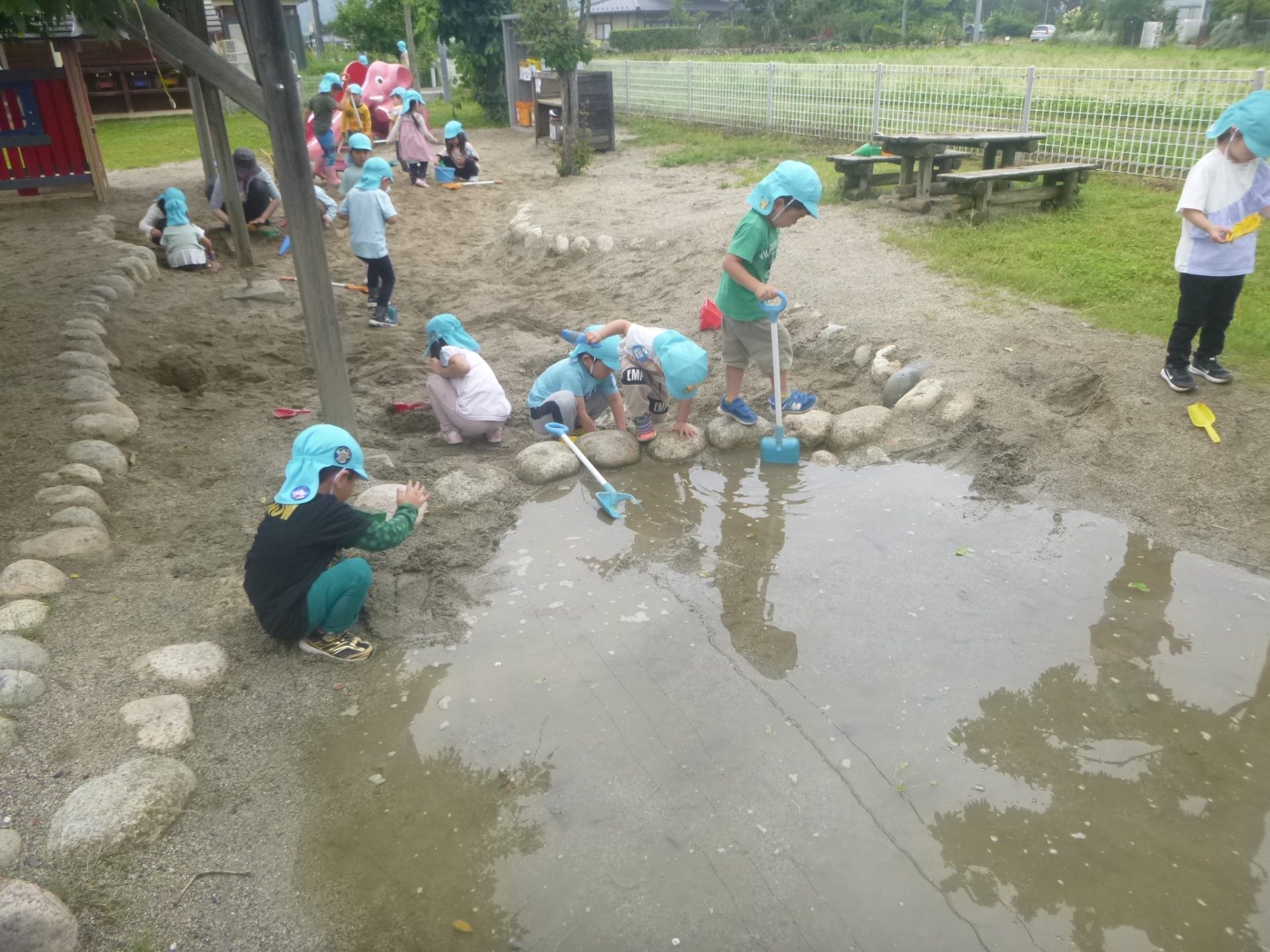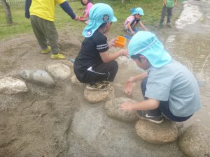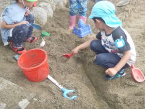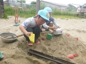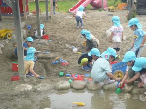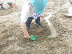 季節ならではの遊びを通して、水や砂、泥など様々な感触を楽しみ、いろいろなことを感じ取ってほしいなと思います。また、同じ遊びを友だちと行う中で、友だちの思いに気づいたり友だちと工夫しながら、遊ぶ楽しさを感じてほしいと思います。