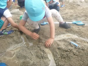「雨の後は、川や形が作りやすいぞ」濡れている砂を実際に触って感じたようです。