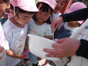 「あ!!先生何持ってるの??」泡立て器と洗面器を抱えています。「すご〜い」「泡ができた!!」