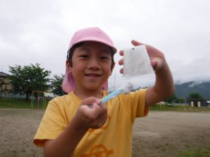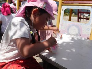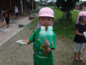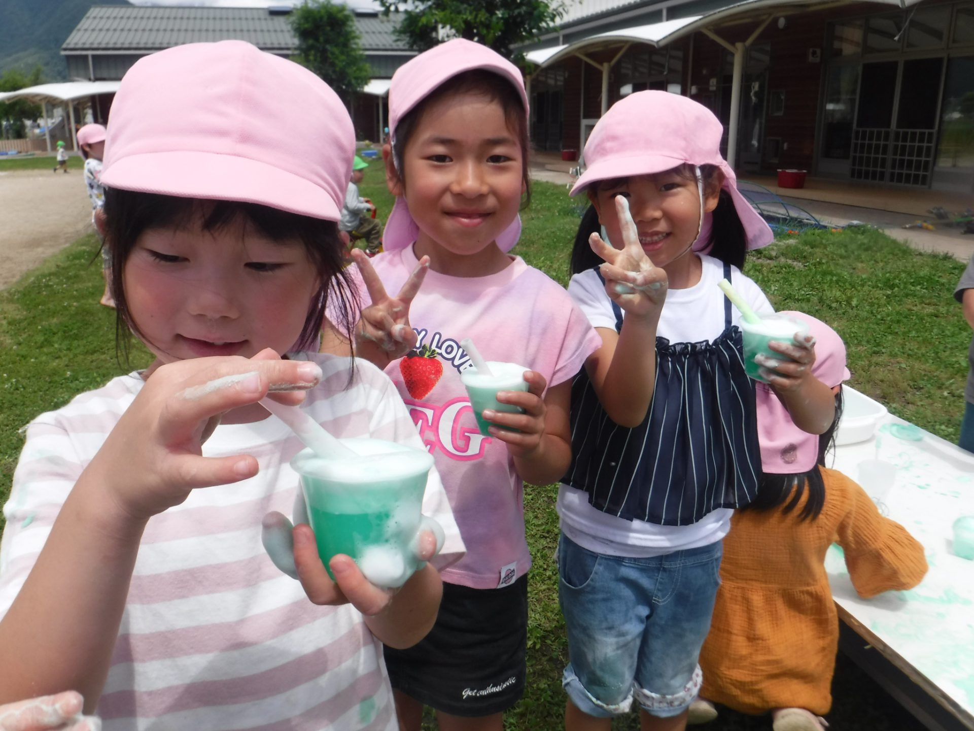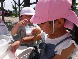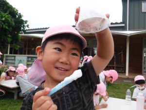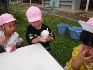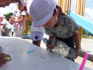 石鹸も遊びの道具の1つになる・・・。様々な素材から遊びの幅を広げてほしい、そんな思いがありました。また、根気が必要だけれど、がんばった分、きれいだったり、楽しいことが待っている。努力したぶん素敵なものができたときの達成感はきっと格別です。これからも継続して試したり、考えたり、発見したり、そんな姿が出てくるような遊びの提供をし、子どもたちの姿を見守って行きたいと思います。