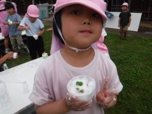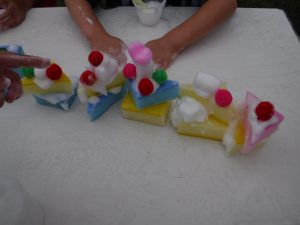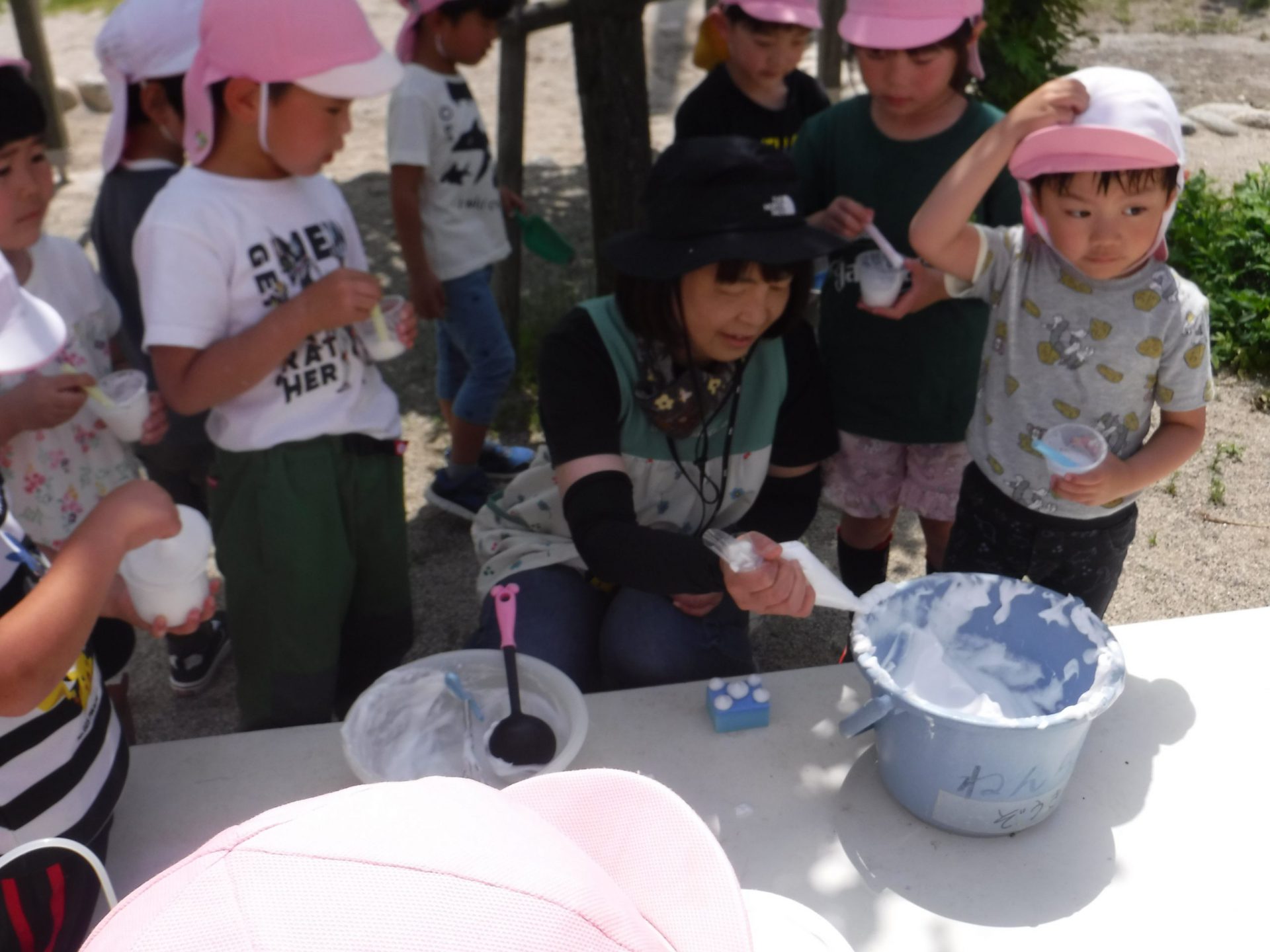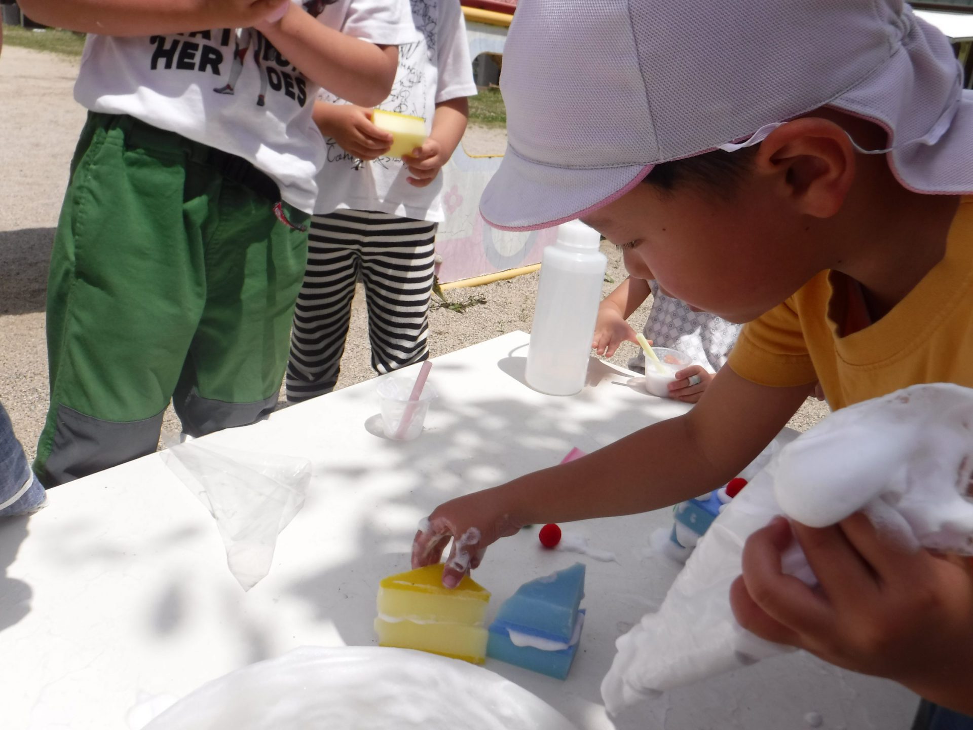 泡を絞り袋に入れると・・・。「わ〜〜!クリームだ」「すごい」「やりたい。やりたい。」みんなでケーキやさんごっこが始まりました。「おいしそうだね」