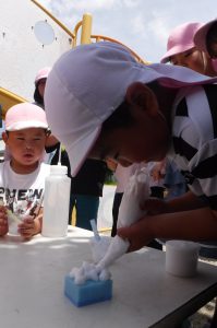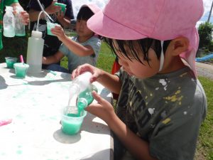 また別の日。今日も泡づくりに夢中な子どもたち。「この前水入れすぎたから、今度はちょっとにしよう」友だちにも「水多いとあわにならないよ。気をつけて!」と声をかけています。