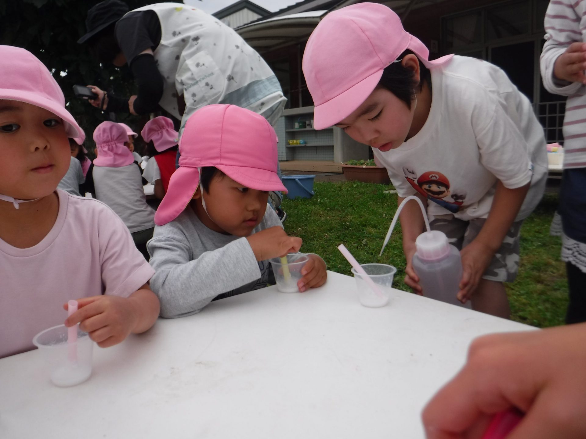 さて泡づくり開始。「あれ??何だか水が多いなあ」「少し多いかもね。減らしてみよう」みんなのカップの泡が固くなってきました。