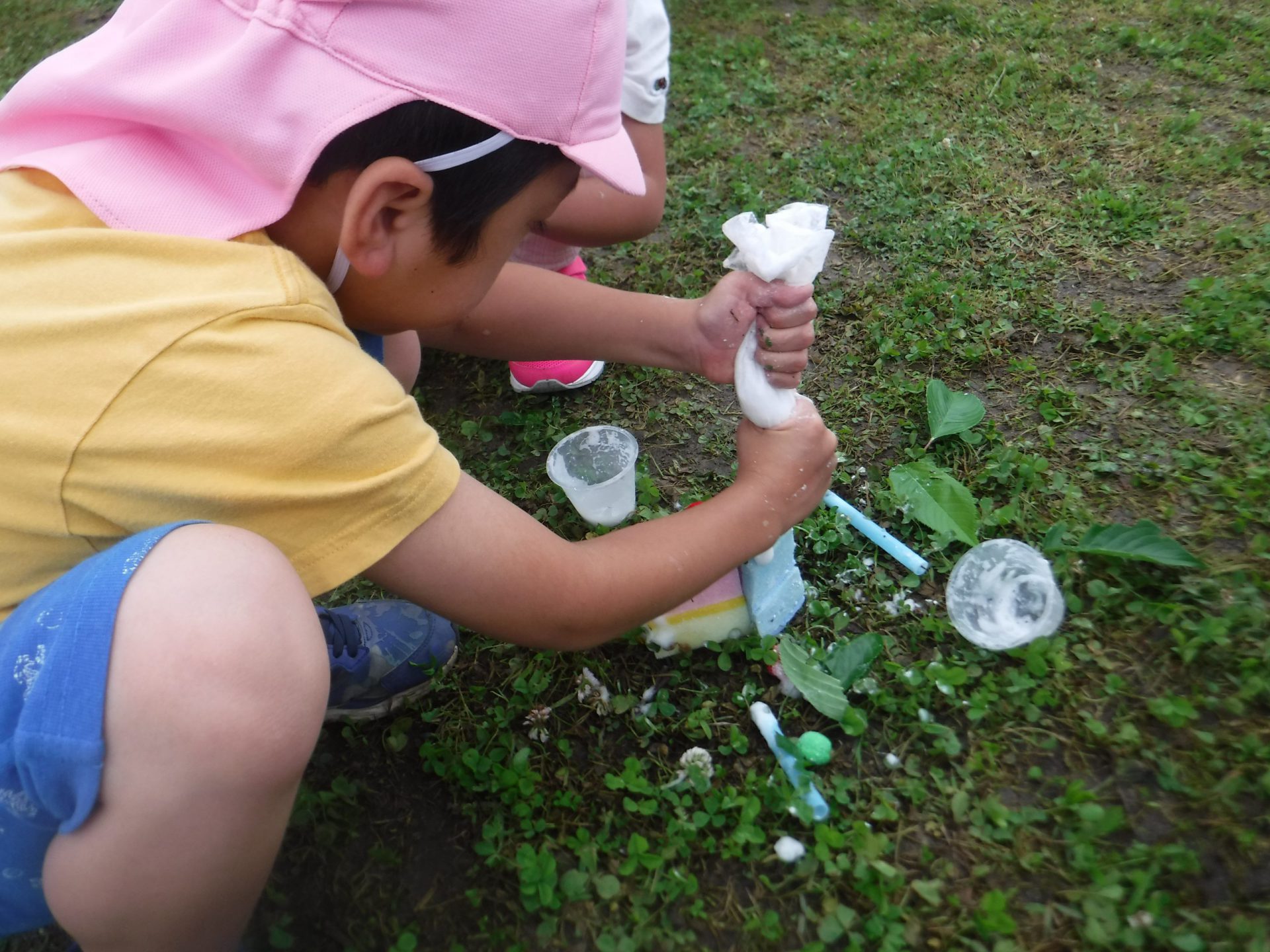泡づくりに挑戦。スプーン1杯の石鹸に、どのくらいの水を入れたら、いい泡になるのか遊びの中で試します。濃厚な泡。水っぽい泡。水は多すぎないほうがいい泡になるようです。泡づくりは、ひたすらまぜまぜ、まぜまぜ。根気が必要な作業。だけど上手にできた泡は、ケーキの生クリームやジューズなどにも使えて、楽しさが待っている。だから頑張れる・・・。