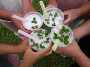 ジュース作りも始まります。トッピングに泡をのせたら、「クリームソーダの出来上がり。」