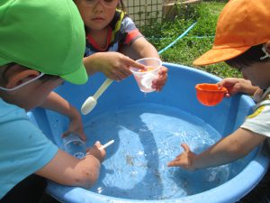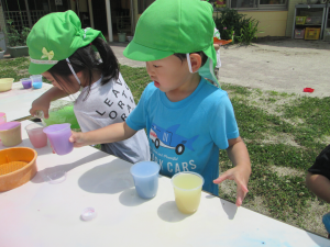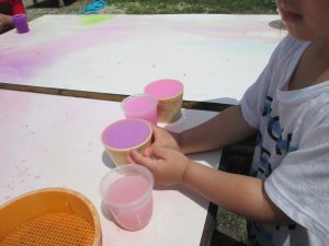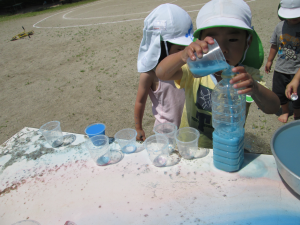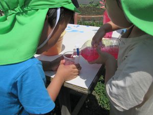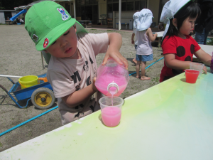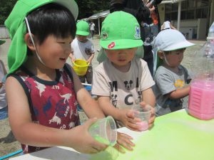 ペットボトルに色水を作ったら子どもたちは大喜びでカップに注ぎ始めました。