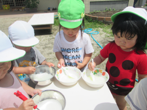 こちらでは魔法の粉(石けん)に水を注いで「あらおいしそうなクリーム!」ができました。